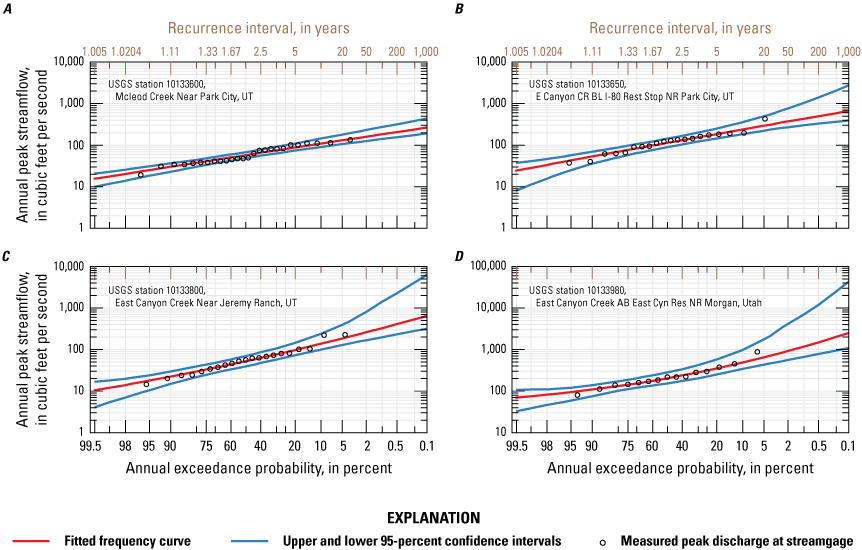Flood frequency analyses were done on East Canyon Creek and McLeod Creek to estimate the Pearson Type III distribution parameters and determine flood frequency. The Expected Moments Algorithm provides a direct fit of the distribution using annual peak streamflow data (fig. 4) and adjustments for potentially influential low floods; these methods are detailed in USGS Bulletin 17C (England and others, 2018). The companion software program developed by the USGS (Flynn and others, 2006; Veilleux and others, 2014), PeakFQ (version 7.4.1), uses annual peak flows to calculate annual exceedance probabilities. Although the streamgage records on East Canyon Creek at USGS streamgages 10133650 (WY 2003), 10133800 (WY 2002), and 10133980 (WY 2008) are relatively short, they still exceed the minimum suggested record length of 10 years (U.S. Geological Survey, 2019) and produce recurrence intervals with adequate confidence. Data through WY 2022 were included in the analyses. The USGS streamgage on McLeod Creek (10133600) was established in 1991 and had a 7-year hiatus in monitoring between 1997 and 2002; all available complete WYs are incorporated into the analysis. Annual peak discharge has typically occurred in the late spring or early summer during the period of record. Kenney and others (2007) provided additional work on flood frequency for streams and rivers in Utah including East Canyon Creek.