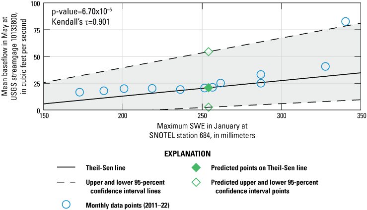 The Theil–Sen line was calculated for all correlation pairs to develop predictive relations between each data pair, such as streamgage and SNOTEL data. Because it is closely related to Kendall’s tau, the Theil–Sen line is not strongly affected by outliers. The senth script published with the supporting materials for Statistical Methods in Water Resources (Helsel and others, 2020b) was used to calculate the Theil–Sen line. This script provides the calculated Theil–Sen slope, upper and lower 95-percent confidence intervals of the slope, and the y-intercept of the Theil–Sen line. The correlation test was not done for tests with tied data that dropped the number of available ranked months below a minimum threshold of n=10; in these instances, all data are recorded as NA (not assessed).