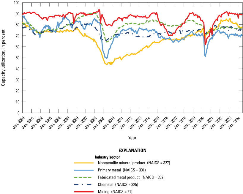 Domestic capacity utilization in these mineral commodity-adjacent industries (fig. 1) has generally fluctuated between 65 and 90 percent during the past 20 or more years. Notable exceptions include the nonmetallic mineral product sector (North American Industry Classification System [NAICS] industry code 327) and the primary metal sector (NAICS 331), which saw capacity utilization plunge to 45 percent and 50 percent, respectively, during the 2007–9 recession. Because these sectors are used in building and construction, it stands to reason that their utilization rates would struggle during an economic downturn (Bureau of Economic Analysis, 2024). An anomaly was observed again starting in 2020 when capacity utilization plummeted to about 50 percent for the primary metal sector and 60 percent on average for other sectors, which is when the 2019 novel coronavirus (COVID–19) spread to the United States (Board of Governors of the Federal Reserve System, 2024b).