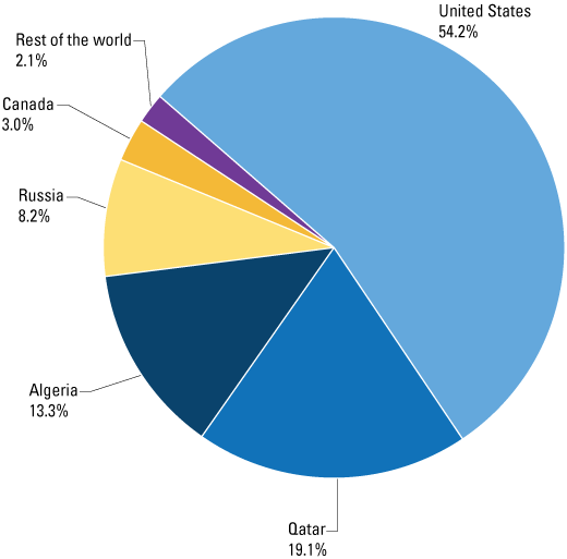 Helium is largely extracted as a byproduct of natural gas (Goodin and Hamak, 2024). There are some cases where helium is extracted as the main product or coproduced with nitrogen. Some quantities of helium are also obtained from recycling and stockpiles provide market flexibility over time when supply and demand differ significantly. Only a portion of the helium extracted with natural gas is refined, and refining capacity determines most of the primary production capacity. The United States and Qatar are the world’s leading producers, and both countries export helium (fig. 6).
