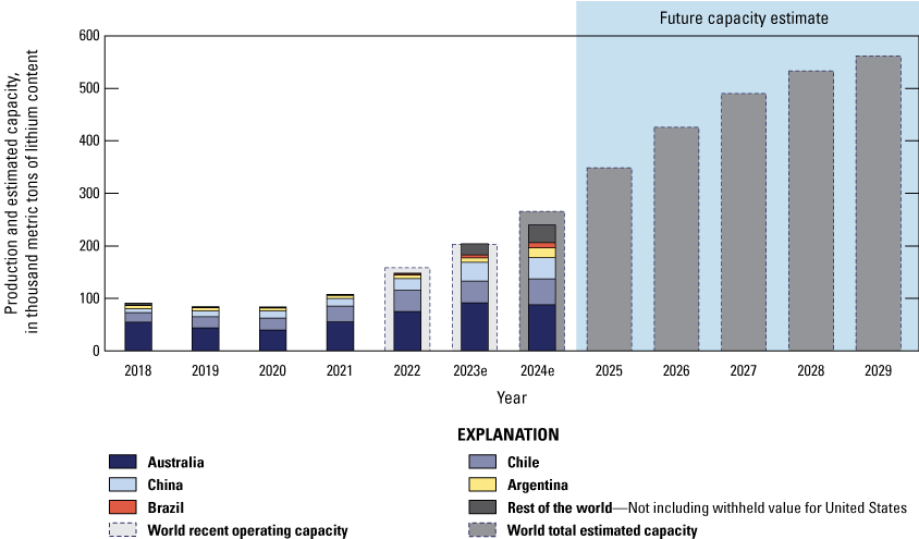 Recent and estimated production and outlook capacity of lithium content in thousand metric tons, by country, for 2018 through 2029. Countries that have lithium production capacity include Argentina, Australia, Austria, Bolivia, Brazil, Canada, Chile, China, Czechia, Congo (Kinshasa), Ethiopia, Finland, France, Germany, Ghana, Mali, Mexico, Namibia, Nigeria, Peru, Portugal, Russia, Rwanda, Serbia, South Africa, Spain, the United Kingdom, and Zimbabwe. Data are from Alonso and others (2025). e, estimated data.