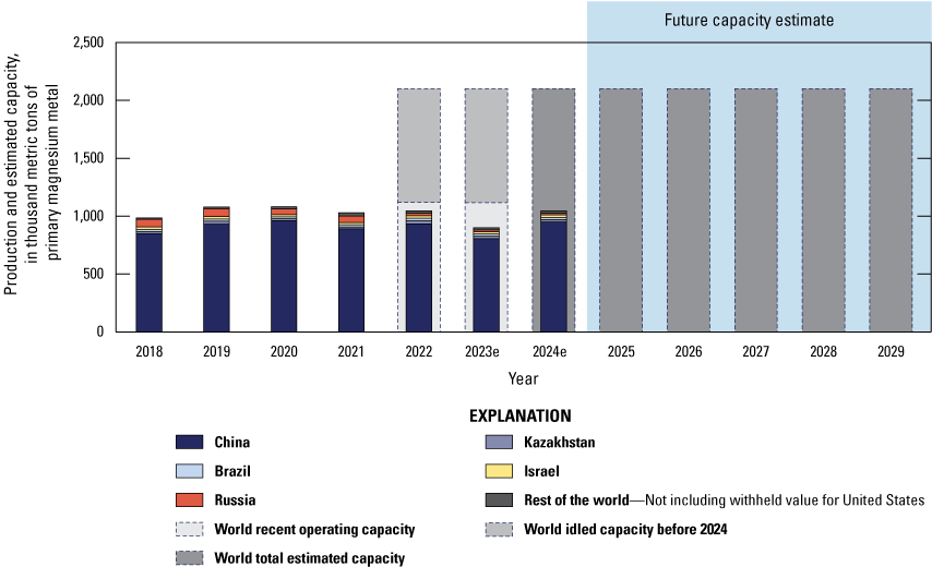 Recent and estimated production and outlook capacity of primary magnesium metal in thousand metric tons, by country, for 2018 through 2029. Countries that have magnesium production capacity include Australia, Brazil, Canada, China, Iran, Israel, Kazakhstan, Malaysia, Russia, Serbia, South Korea, Turkey, Ukraine, and the United States. Data are from Alonso and others (2025). e, estimated data.