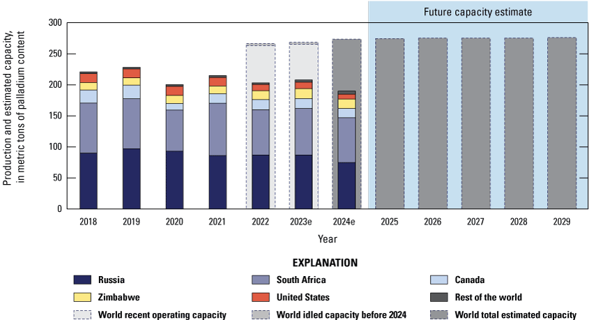 Recent and estimated mine production and outlook capacity of palladium (metal content), in metric tons, by country, for 2018 through 2029. Countries that have palladium production capacity include Australia, Canada, China, Finland, Russia, Serbia, South Africa, the United States, and Zimbabwe. Data are from Alonso and others (2025). e, estimated data.