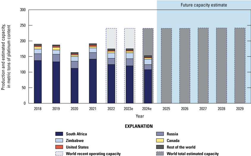 Recent and estimated mine production and outlook capacity of platinum (metal content), in metric tons, by country, for 2018 through 2029. Countries that have platinum production capacity include Australia, Canada, China, Colombia, Ethiopia, Finland, Russia, Serbia, South Africa, the United States, and Zimbabwe. Data are from Alonso and others (2025). e, estimated data.