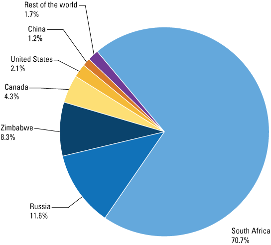 More so than palladium, platinum mine production is highly concentrated in South Africa (fig. 15). As with palladium, recent efforts to stabilize the power supply will likely improve platinum supply stability, but uncertainty remains. Recycling is highly dependent on the price of platinum. Additionally, vehicle retirements, a major source of recycled platinum, have trended down recently, thereby reducing the amount of platinum available for recycling.