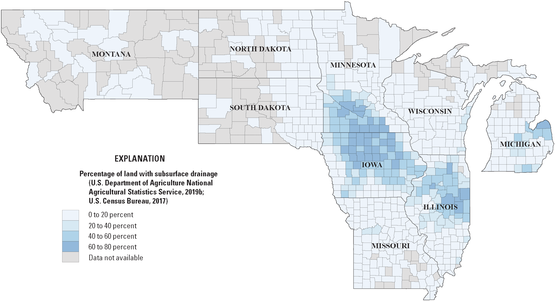 Nakagaki, N., Wieczorek, M.E., and Qi, S.L., 2016, Estimates of subsurface tile drainage extent for the conterminous United States, early 1990s: U.S. Geological Survey data release, accessed February 27, 2023, at https://doi.org/10.5066/F7RB72QS.