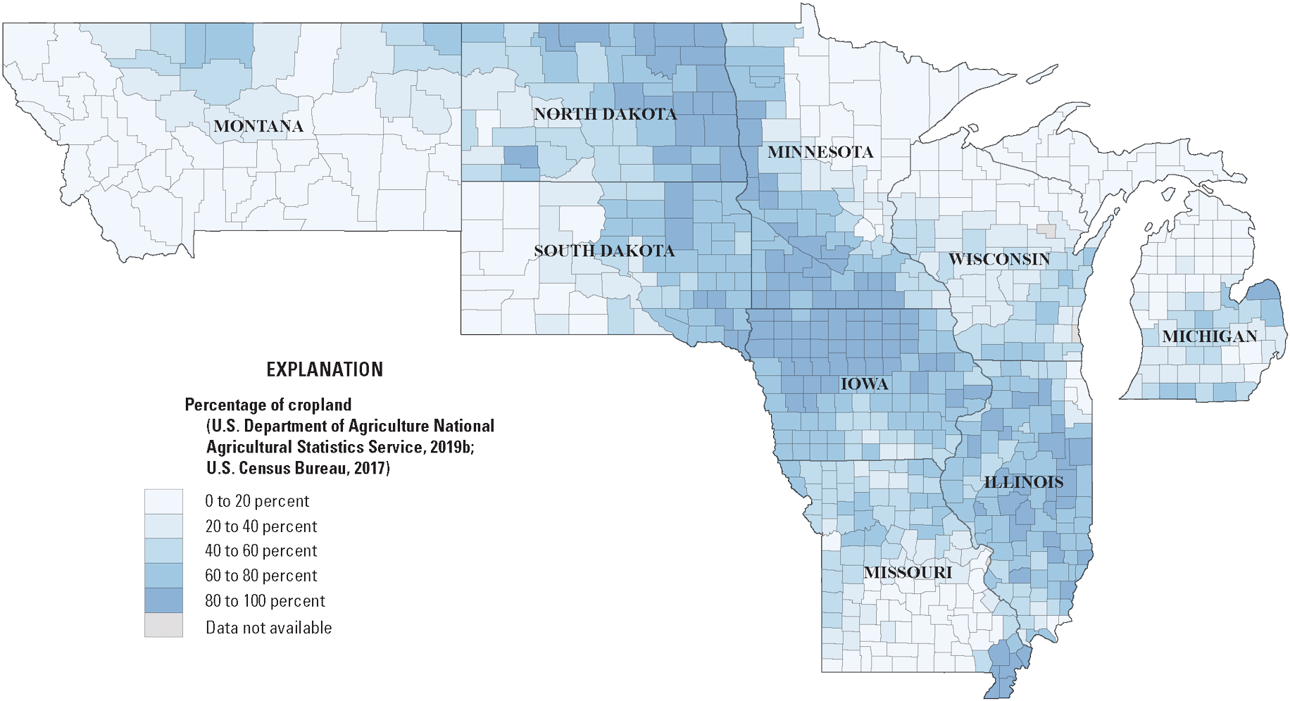 Map showing the percentage of land by county with cropland in the nine-State study region (U.S. Department of Agriculture National Agricultural Statistics Service [USDA NASS], 2019b; U.S. Census Bureau, 2017). Cropland data are from the 2017 USDA Census of Agriculture (USDA NASS, 2019a).