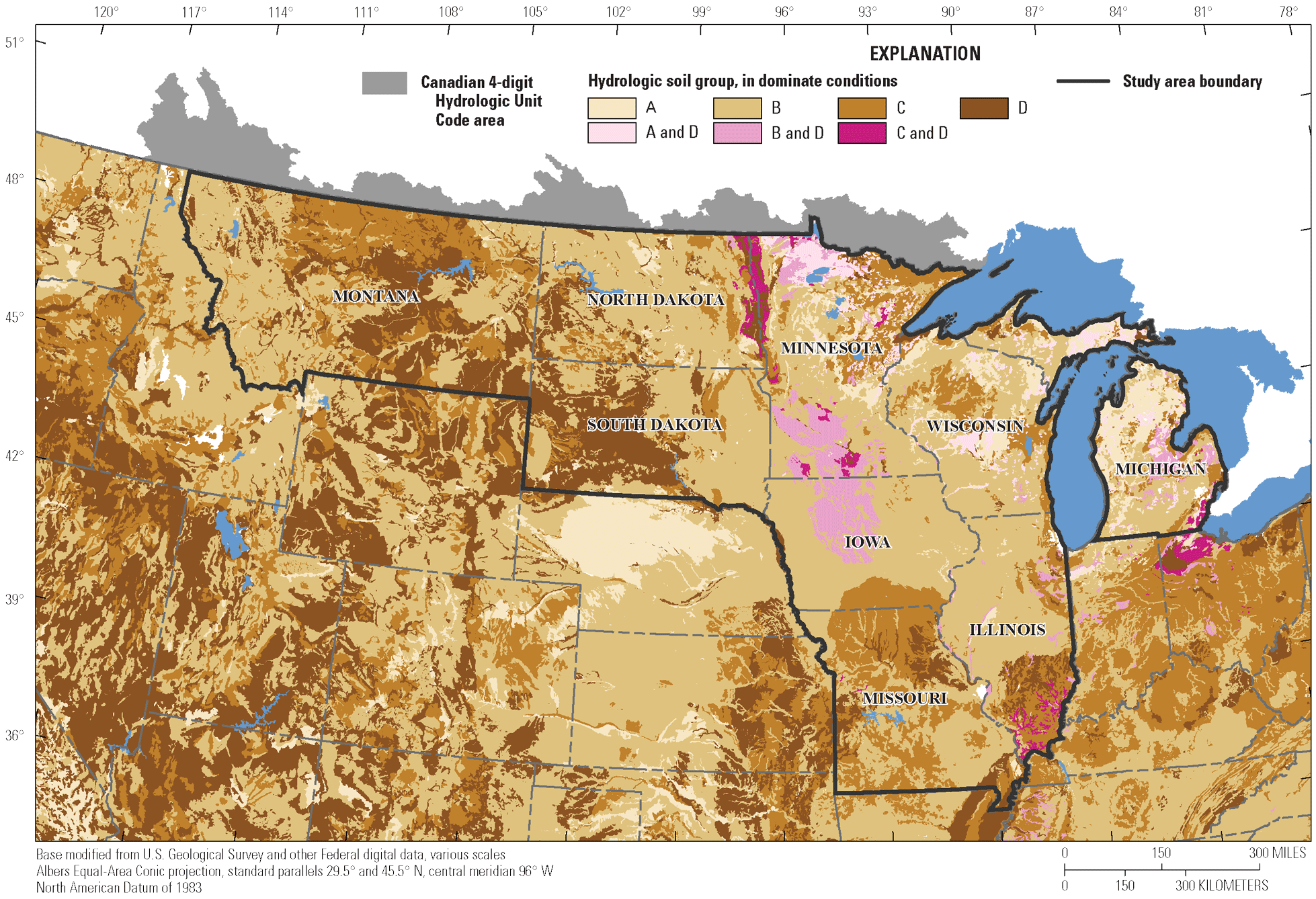 Regional maps of cropland, hydrologic soil groups, and annual precipitation show that subsurface drainage, in the defined study area, is concentrated in areas with cropland, poorly drained soils, and humid climates. Cropland is distributed throughout the study area (fig. 2); however, data from the 2017 U.S. Department of Agriculture (USDA) Census of Agriculture indicate that counties with the greatest percentage of subsurface drainage are concentrated in southern Minnesota, north central Iowa, central Illinois, and parts of Michigan (fig. 1).
