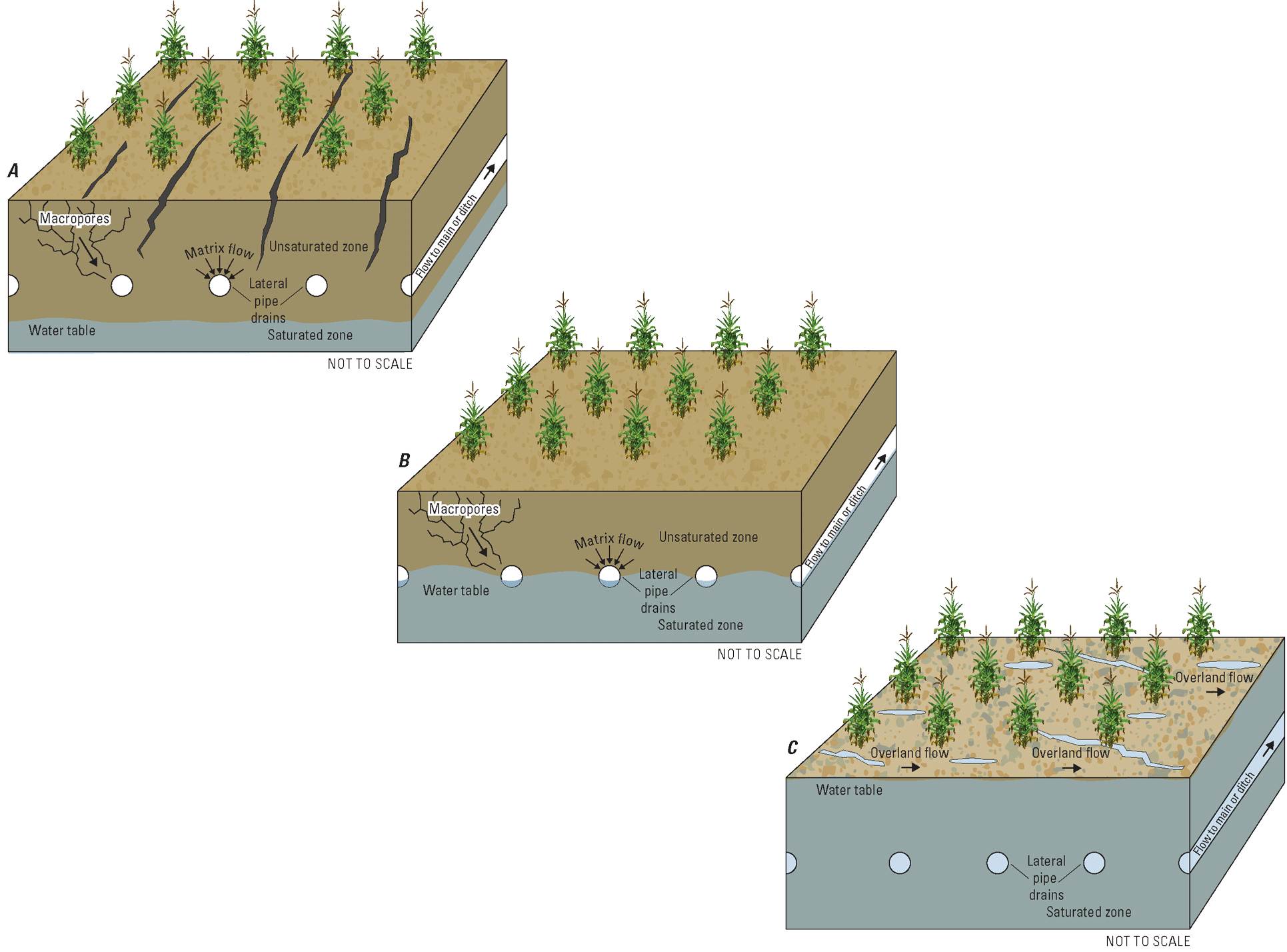 Diagram showing an example subsurface agricultural drainage system under different hydrologic conditions, including A. dry, B. saturated, and C. fully saturated conditions. Included in these figures are possible flow paths for storm water including overland flow, matrix flow, and flow through macropores.