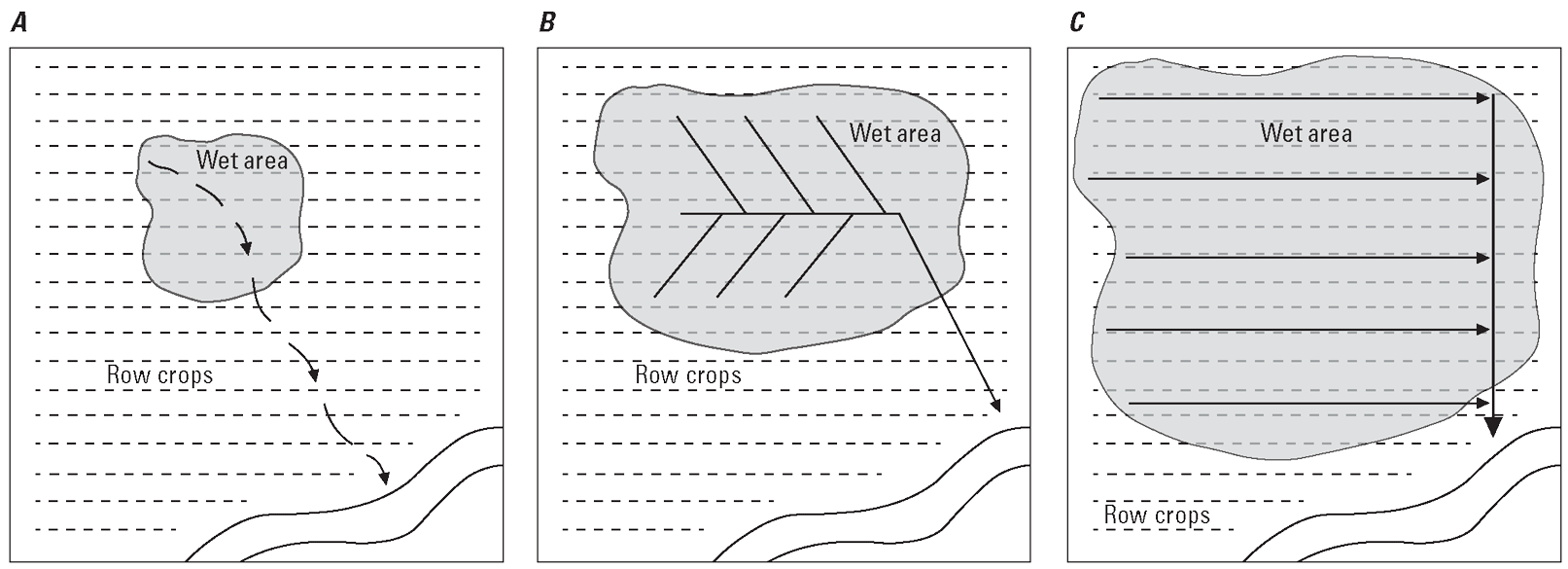 Diagram showing examples of pipe drain patterns in subsurface agricultural drainage systems. A, Custom pattern to target wet areas within a field of row crops. B, The herringbone design. C, the grid pattern that uses laterals connected to a main pipe drain to uniformly drain a large area. Modified from figure 4 (Minnesota Groundwater Association, 2018).