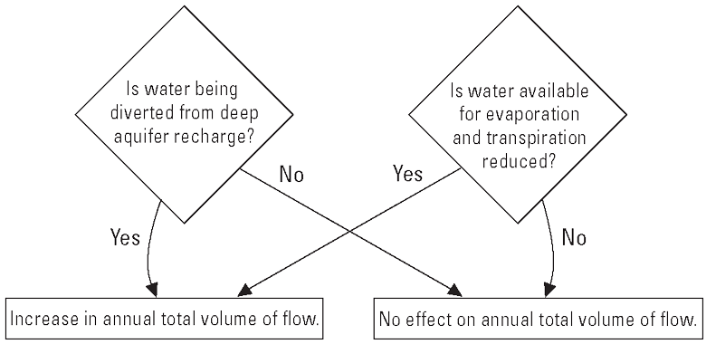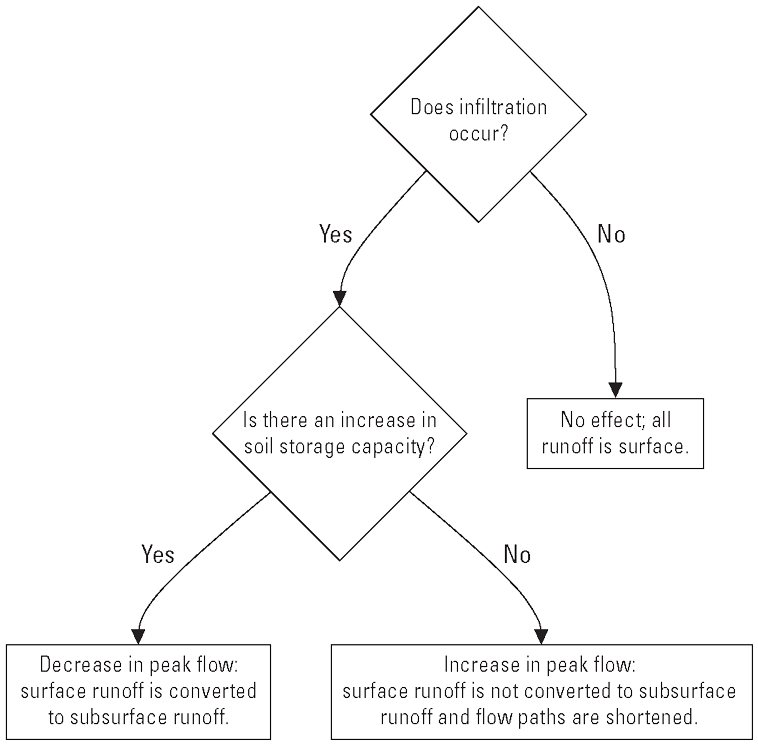 The effects that subsurface drainage has on hydrologic systems are expected to vary by site and are seasonally based on system design, soil type, moisture conditions, precipitation characteristics, and land conditions. Subsurface drainage can affect the magnitude of peak flow by converting surface runoff from a storm event to subsurface runoff. By increasing hydrologic connectivity of a catchment, subsurface drainage can increase non-event flow or the flow between two storm events, typically dependent on lateral flow through the subsurface and groundwater. Theoretically, by diverting water from groundwater recharge or by reducing water available for evapotranspiration, subsurface drainage may increase the total volume of flow. Precipitation changes may increase infiltration, excess overland flow, and flood risk regardless of the presence or absence of subsurface drainage.