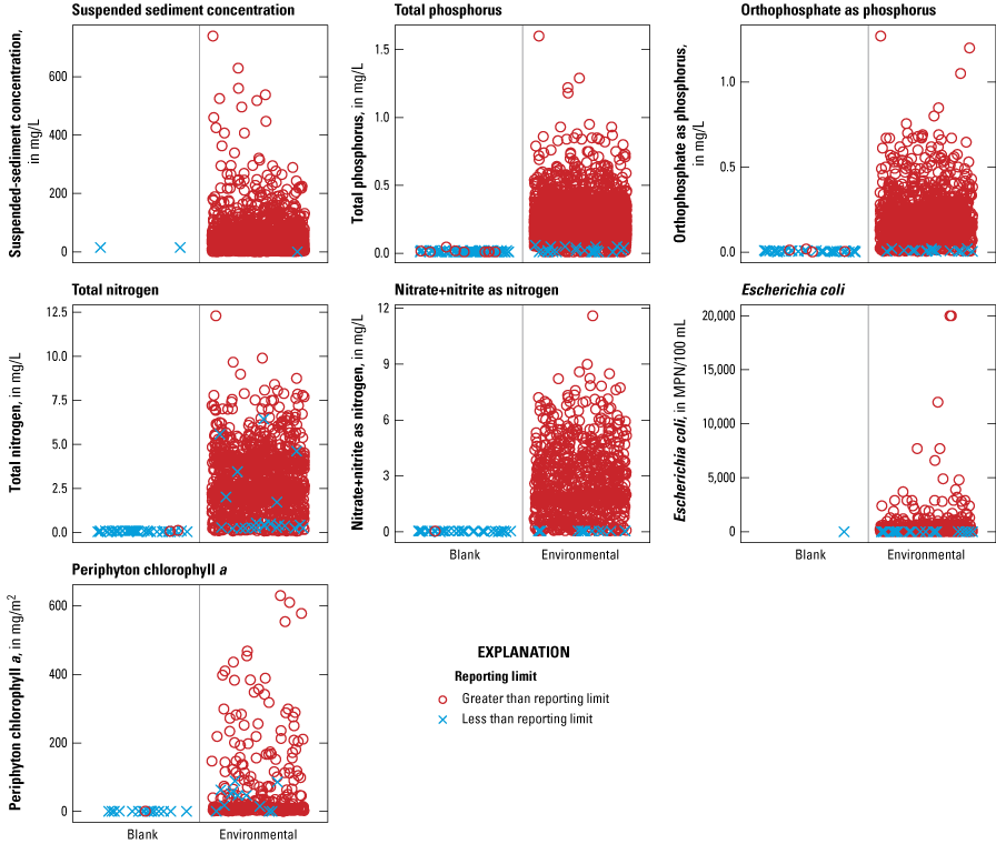Constituent concentrations in blank samples compared to environmental samples in the lower Boise River and select tributaries, Idaho, water years 1994–2023. [mg/L, milligrams per liter; mg/m2, milligrams per square meter; MPN/100 mL, most probable number per 100 milliliters].