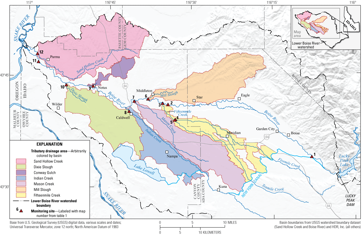 The lower Boise River watershed and the monitoring locations in the current study were described in detail by Etheridge (2013) and Etheridge and others (2014) and are briefly described here. The lower Boise River extends 103 kilometers (km) from the outflow of Lucky Peak Dam to the confluence with the Snake River. Along this reach, the river flows through the cities of Boise, Garden City, Eagle, Star, Middleton, Caldwell, Notus, and Parma, Idaho. We collected samples at three mainstem locations spanning most of the length of the lower Boise River. From upstream to downstream, these were the Boise River at Eckert Road (U.S. Geological Survey [USGS] site 13203760), the Boise River at Middleton (USGS site 13210050), and the Boise River near Parma (USGS site 13213000; fig. 1; table 1; U.S. Geological Survey, 2024). The Boise River at Eckert is located upstream from most urban and agricultural influences and is considered relatively pristine (Etheridge and others, 2014). Between Eckert and Middleton, urbanization increases and the Boise River receives effluent from the City of Boise’s Lander and West Boise wastewater treatment plants. No major tributaries enter the Boise River between Eckert and Middleton, but water is withdrawn via several large diversions, reducing the streamflow in this reach during the summer irrigation season. Downstream from Middleton, several major tributaries enter the Boise River, including, from upstream to downstream, Fifteenmile Creek, Mill Slough, Mason Creek, Indian Creek, Conway Gulch, and Dixie Slough (fig. 1; table 1). These tributaries drain large areas of agricultural land and, in some cases, receive municipal wastewater effluent (for example, Indian Creek, Mill Slough, Conway Gulch, and Fifteenmile Creek via its tributary Fivemile Creek), and have previously been identified as important sources of sediment and nutrients to the lower Boise River (Etheridge, 2013; Etheridge and others, 2014). The Boise River near Parma, near the confluence with the Snake River, is located downstream from these major tributaries and therefore represents the mix of agricultural and urban influences in the watershed. Samples were also collected at Sand Hollow Creek, which receives wastewater from the City of Parma. Although Sand Hollow Creek discharges to the Snake River, it is generally considered to be part of the lower Boise River system and is included in the lower Boise River TMDL (Idaho Department of Environmental Quality, 2015a).