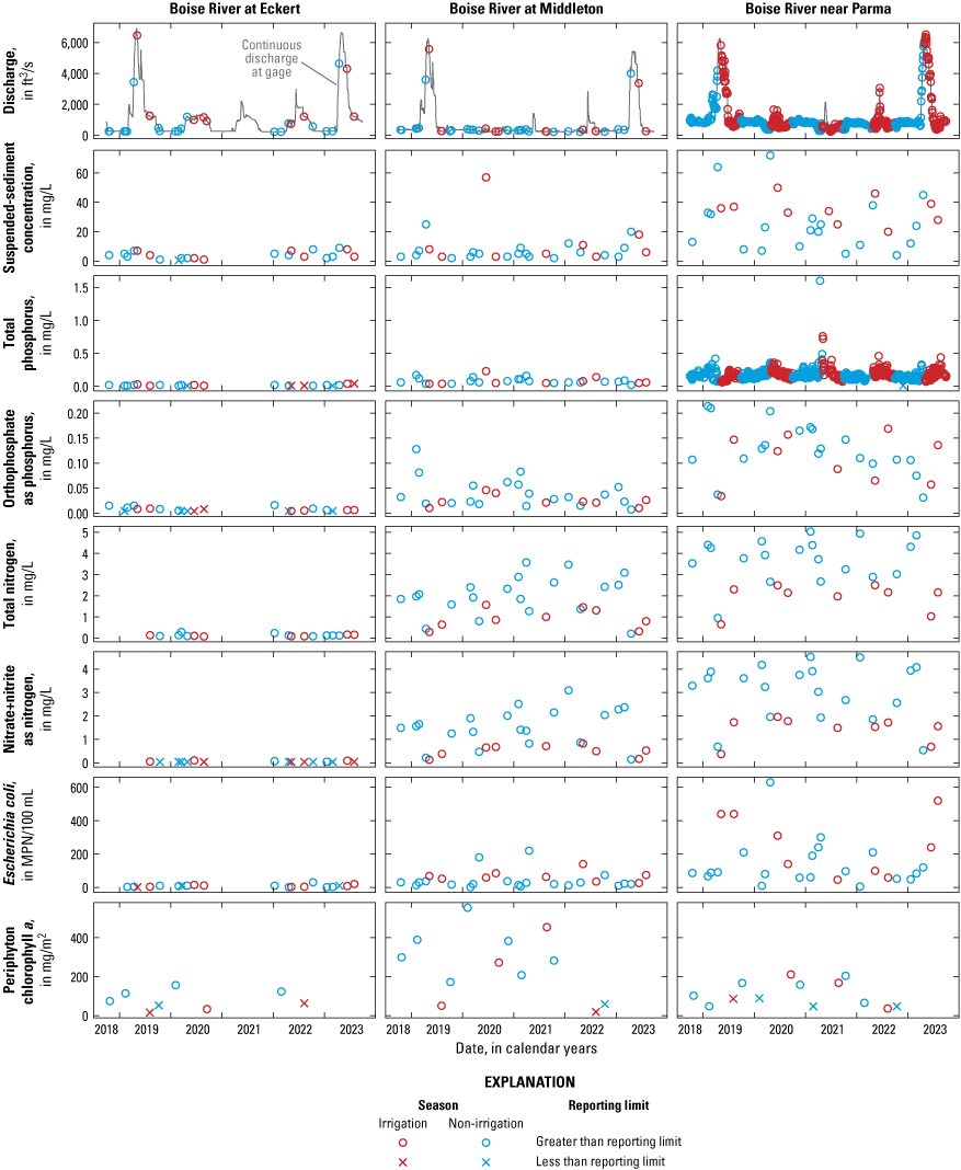 Concentrations of most of the monitored constituents increased considerably along the mainstem Boise River from Eckert to Middleton to Parma during the irrigation and non-irrigation seasons in 2019–2023. The measured concentrations of TP, OP, TN, nitrate plus nitrite, and E. coli all increased at least tenfold from Eckert to Parma (fig. 4; tables 5, 6). The only constituent that did not follow this spatial trend was periphyton chl-a, which occurred in the greatest concentrations at Middleton based on the limited data available (fig. 4). At Parma, the highest measured concentrations of SSC, E. coli, and to a lesser extent, TP, occurred in late spring–early summer, following the seasonal pattern of discharge (fig. 5). This pattern was less apparent at Eckert and Middleton. The mean proportion of TP as OP was the same during the irrigation and non-irrigation seasons at Eckert, but it was lower during the irrigation season at Middleton and Parma (fig. 5; tables 5, 6), likely associated with higher flows diluting OP contributions from groundwater, wastewater treatment plants, and other sources. Concentrations of OP, TN, and nitrate plus nitrite followed a seasonal pattern opposite that of SSC, E. coli, and TP, with lower concentrations during late spring to mid-summer (fig. 5). The percentage of TN in the form nitrate plus nitrite decreased during the irrigation season at Middleton and Parma (fig. 5; tables 5, 6), consistent with the understanding that nitrate plus nitrite is groundwater sourced and is diluted by higher flows.