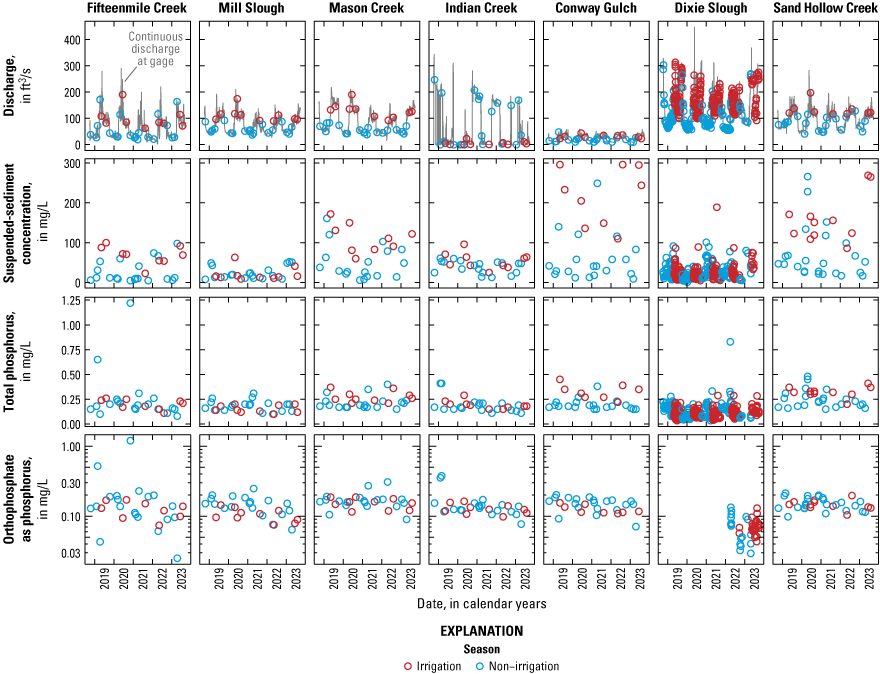 Measured constituent concentrations and corresponding discharges used in the analysis of recent spatial and seasonal patterns at Boise River tributaries and Sand Hollow Creek, Idaho water years 2019–23. Note the y-axes for orthophosphate are log10-transformed. [ft3/s, cubic feet per second; mg/L, milligrams per liter]