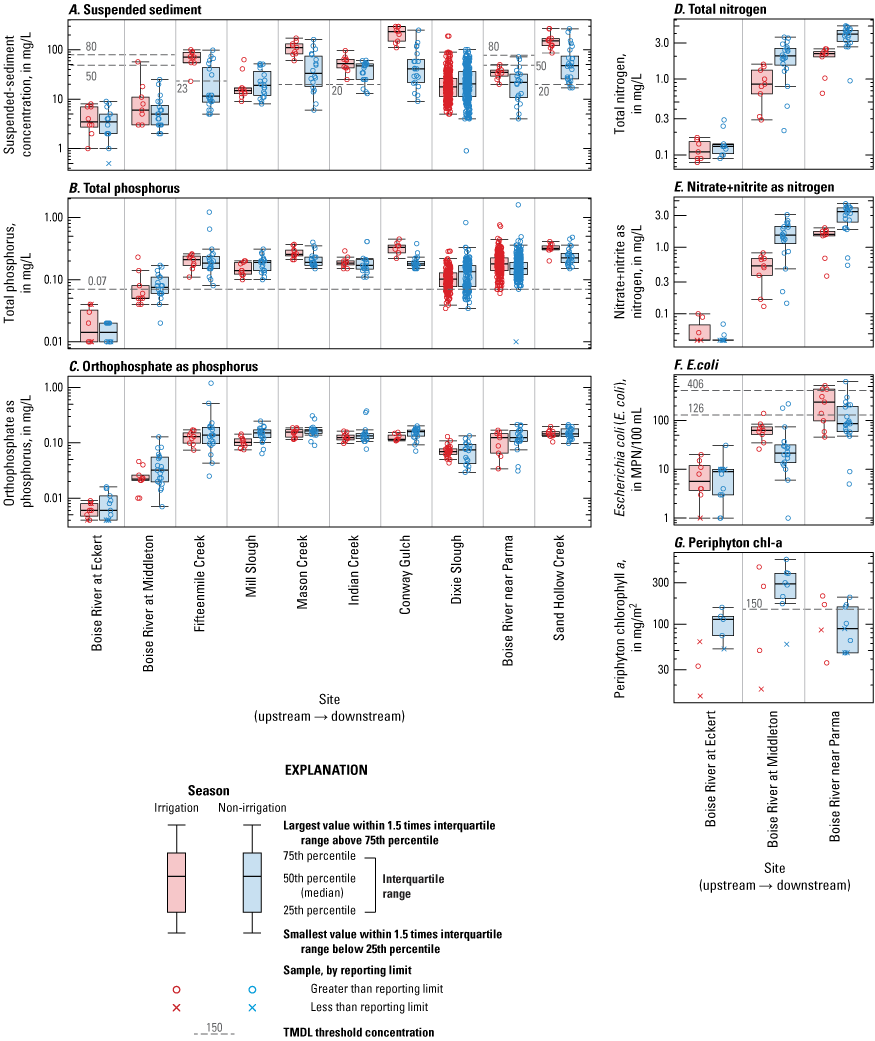 For decades, regulatory efforts have sought to restore the beneficial uses of the lower Boise River, as well as the Snake River downstream (Idaho Department of Environmental Quality, 1999; Idaho Department of Environmental Quality and Oregon Department of Environmental Quality, 2004). Most recently, in 2015, total maximum daily loads (TMDLs) of total phosphorus (TP), periphyton chlorophyll a (chl-a), SSC, and E. coli were established or revised from previous TMDLs (Idaho Department of Environmental Quality, 2015a, 2015b). The TMDL target for TP was set at less than or equal to (≤) 0.07 milligrams per liter (mg/L) at the Boise River near Parma and its tributaries during the May 1–September 30 irrigation season (Idaho Department of Environmental Quality, 2015b). The TMDL target for mean monthly periphyton chl-a was set at ≤150 milligrams per square meter (mg/m2) in the Boise River from Middleton to the mouth (Idaho Department of Environmental Quality, 2015b). Sediment TMDL targets in the main stem of the lower Boise River were established at 50 mg/L SSC for ≤60 days, or 80 mg/L SSC for ≤14 days (Idaho Department of Environmental Quality, 1999). Sediment TMDLs were also established for select tributaries, including Fifteenmile Creek (mean of 23 mg/L SSC for greater than or equal to [≥] 84 days) and Sand Hollow, Mason, and Indian Creeks (mean of 20 mg/L SSC for ≥4 months; Idaho Department of Environmental Quality, 2015a). The TMDL criterion for E. coli was based on a geometric mean of 126 E. coli organisms per 100 milliliters (mL), calculated from a minimum of 5 samples taken every 3–7 days over a 30-day period (Idaho Department of Environmental Quality, 2015a). The requirement to calculate the geometric mean is triggered by a single sample concentration exceeding 406 E. coli organisms per 100 mL in waters designated as primary contact recreation (including Dixie Slough and the lower Boise River), or 576 E. coli organisms per 100 mL in waters designated as secondary contact recreation (including Indian Creek, Mason Creek, Fifteenmile Creek, and Sand Hollow Creek; Idaho Department of Environmental Quality, 2014, 2015a).