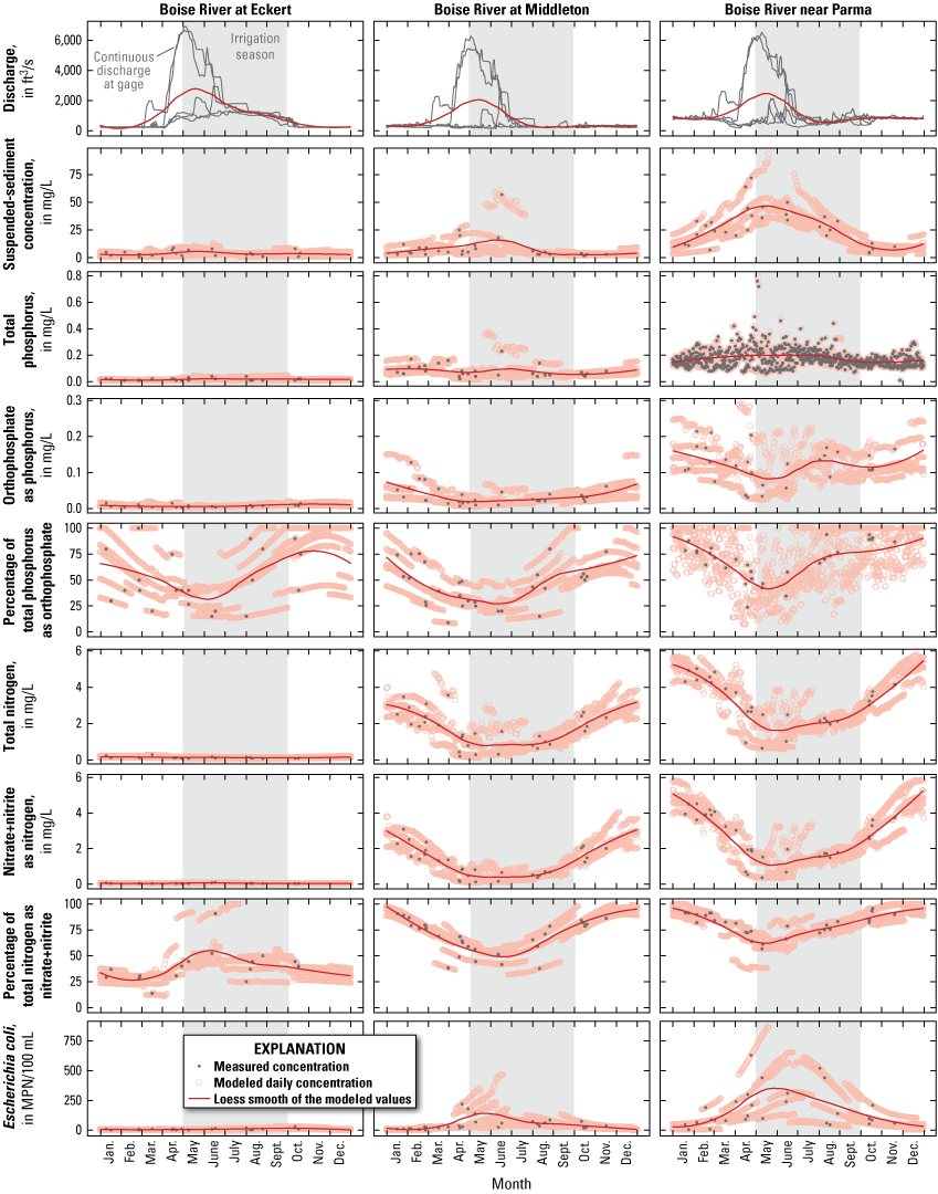 Recent spatial and seasonal patterns in constituent concentrations and loads were evaluated using data from 29 synoptic sampling events during the 5-year period from water year 2019–2023. Measured concentrations and daily discharge data were used to estimate concentrations and loads for each day of the 5-year period using the composite method in the R package loadflex (Appling and others, 2015). The composite method uses measured values when available, and estimates values for days between measured values using a combination of regression and interpolation (Aulenbach and Hooper, 2006). The regression models used in the composite method were based on LOADEST model number 7, which includes predictor variables for streamflow and season (Runkel and others, 2004; Lorenz and others, 2015). Loads are reported as mass per day (SSC, TP, OP, TN, nitrate plus nitrite) or most probable number per day (E. coli). Loads were not calculated for periphyton chl-a, as it is generally not a constituent that is transported in streamflow. To help highlight the importance of individual sites relative to others, loads are also presented as percentages of the total inflow load, where the total inflow load is the sum of loads from all monitored sites upstream from the Boise River near Parma (in other words, the Boise River at Middleton, Fifteenmile Creek, Mill Slough, Mason Creek, Indian Creek, Conway Gulch, and Dixie Slough). Comparing this total inflow load to the load at Boise River near Parma (the outflow) provided insights into the presence of unmeasured sources (tributaries, drains, groundwater seeps) or sinks (deposition/storage, biological uptake, loss to groundwater) between Middleton and Parma.