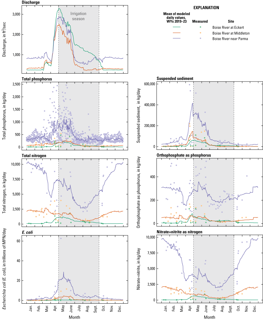 Seasonal patterns in discharge and loads at mainstem lower Boise River sites, Idaho, water years (WYs) 2019–2023. [ft3, cubic feet; kg/day, kilograms per day; MPN/day, most probable number per day]