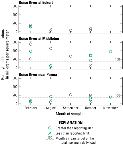 Measured concentrations above TMDL targets were frequent for some constituents at lower Boise River sites during 2019–2023 (fig. 4). Concentrations of TP were greater than the TMDL target of 0.07 mg/L in 33 percent of samples from Boise River at Middleton and 99 percent of samples at Boise River near Parma during the irrigation (and TMDL) season. Periphyton chl-a concentrations were greater than the mean monthly TMDL target of 150 mg/m2 in 75 percent of year-round samples from Boise River at Middleton and in 38 percent of samples from Boise River near Parma. Among the months represented by recent samples at Boise River at Middleton, some of the highest concentrations occurred during February (fig. 7). E. coli concentrations were greater than the TMDL target of 406 MPN/100 mL in 14 percent of samples at Boise River near Parma; and were greater than the TMDL target of 126 MPN/100 mL in 41 percent of samples at Boise River near Parma and in 14 percent of samples at Boise River at Middleton. Concentrations of SSC above the TMDL targets were infrequent, with 3.4 percent of samples from Middleton and 6.6 percent of samples from Parma greater than the 50 mg/L threshold, and no samples greater than the 80 mg/L threshold. Notably, many of these TMDL targets (for example, periphyton chl-a; the E. coli threshold of 126 MPN/100 mL; and SSC) are intended to be evaluated using means of multiple samples over a given time period. Therefore, a single sample above a target concentration does not necessarily indicate a TMDL exceedance.