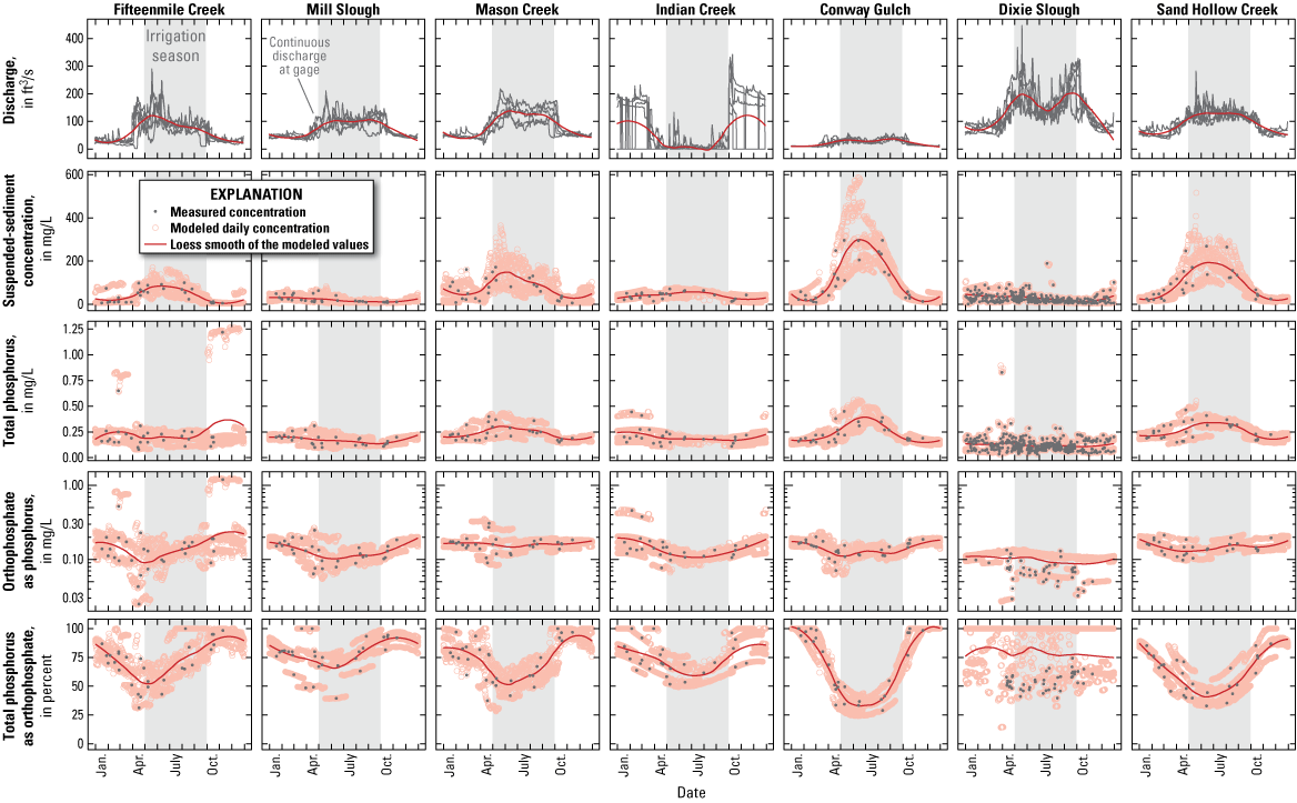 Seasonal patterns in discharge and measured and modeled constituent concentrations at lower Boise River tributaries and Sand Hollow Creek, Idaho, water years 2019–23. [ft3/s, cubic feet per second; mg/L, milligrams per liter]