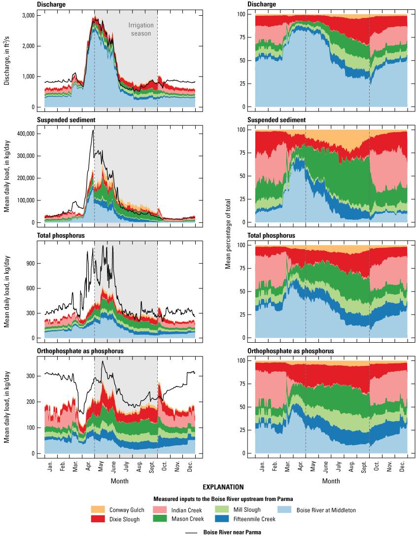 Fivemile Creek and Tenmile Creek are the two primary tributaries to Fifteenmile Creek. During the non-irrigation season, Fivemile Creek contributed slightly more discharge than Tenmile Creek (55 percent versus 45 percent of the total, respectively) but considerably more SSC (76 percent), TP (74 percent), and OP (71 percent; fig. 10), potentially associated in part with the discharge of the City of Meridian’s wastewater effluent to Fivemile Creek. During the irrigation season, mean discharge increased 1.8-fold at both sites. At Fivemile Creek, loads of SSC, TP, and OP also increased during the irrigation season, but disproportionately less than the increase in discharge (1.03–1.5-fold increases over the non-irrigation season loads) indicating a dilution effect by higher flows in the irrigation season. The mean percentage of TP as OP was nearly unchanged (60 percent) in Fivemile Creek between the irrigation and non-irrigation seasons. In contrast, at Tenmile Creek, loads of SSC increased 4.0-fold, loads of TP increased 2.9-fold, and the percentage of TP as OP decreased to 53 percent during the irrigation season. These results suggest greater mobilization of particulates during the irrigation season in the Tenmile Creek watershed compared to Fivemile Creek.