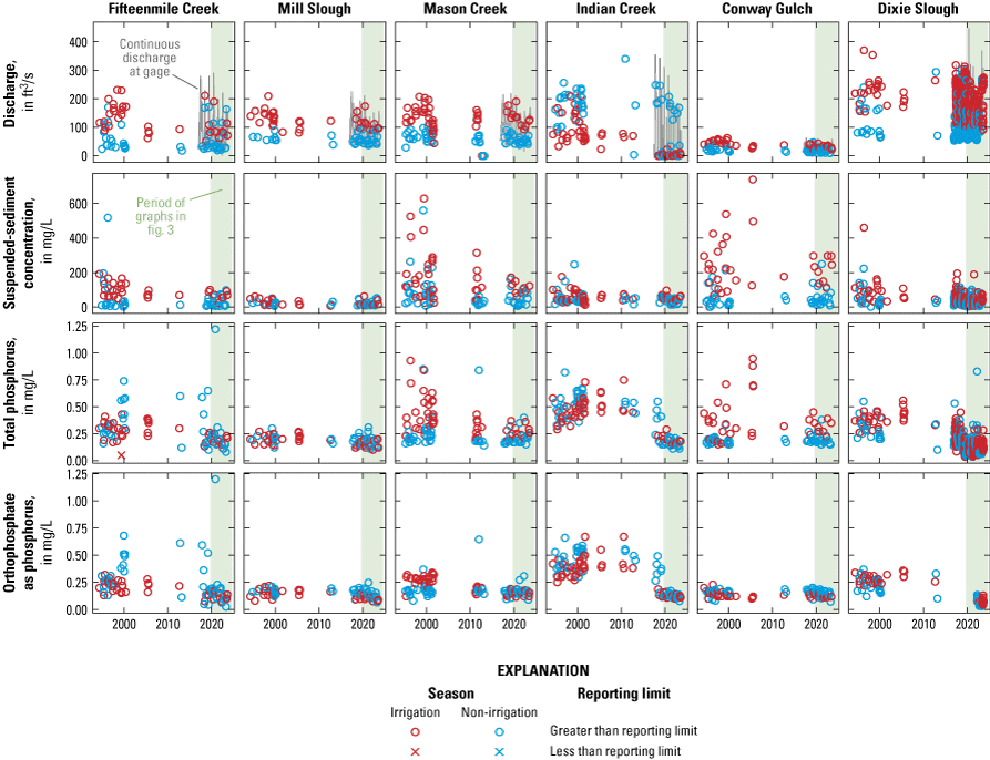 Measured constituent concentrations and corresponding discharges used in the trends analysis at Boise River tributaries, water years 1994–2023. Green bars highlight the water year 2019–23 period used to characterize spatial and seasonal patterns in recent years. Daily discharge values were not available for the entire period. [ft3/s, cubic feet per second; mg/L, milligrams per liter]