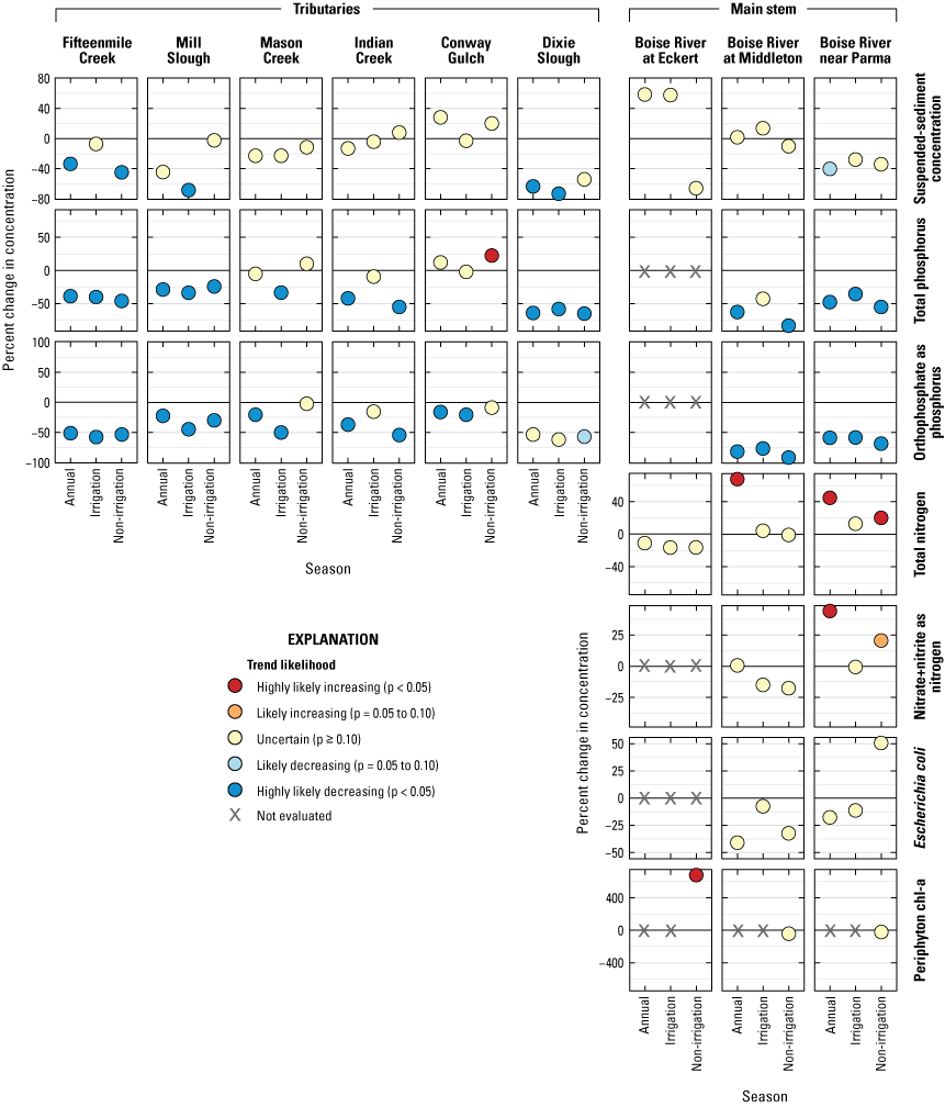 Temporal trends in measured concentrations were evaluated for the 30-year period from 1994–2023 for SSC, TP, OP, TN, nitrate plus nitrite, and periphyton chl-a; and from 1999 to 2023 for E. coli. The starting years were selected based on the beginning of regular monitoring across all sites, with at least one sample collected in each season (irrigation and non-irrigation seasons). Trends in periphyton chl-a concentrations were limited to samples collected in October–November because 64 percent of all samples were collected during those 2 months, and data in other months were lacking, especially in the early part of the record. At mainstem Boise River sites, trends were also evaluated for measured concentrations during the 15-year period from 2009 to 2023. Many watershed improvements occurred during this more recent period, and the resulting water-quality trends were not always well-represented by a monotonic trend analysis over 30 years. Trends were not evaluated for 2009–2023 at tributary sites because of inadequate data during the first half of that period.