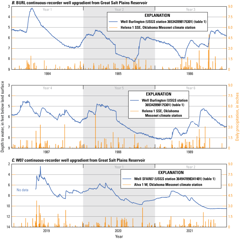 River alluvial aquifers in Oklahoma were combined for this analysis (fig. 1). The Salt Fork Arkansas River alluvial aquifer is classified as a major aquifer, and the Chikaskia River alluvial aquifer is classified as a minor aquifer by the OWRB (2012a). Because the two aquifers are physically connected and presumably have the same geologic history and source material, this report generally discusses them as one entity, referred to herein as the “Salt Fork Arkansas River and Chikaskia River alluvial aquifers” unless enough data are available to describe them separately. Furthermore, when data availability allows for more detailed discussion, the Salt Fork Arkansas River alluvial aquifer is split into two reaches: one covering the part of the aquifer west of the Great Salt Plains Reservoir dam (upgradient) and the other covering the part of the aquifer east of the Great Salt Plains Reservoir dam (downgradient).