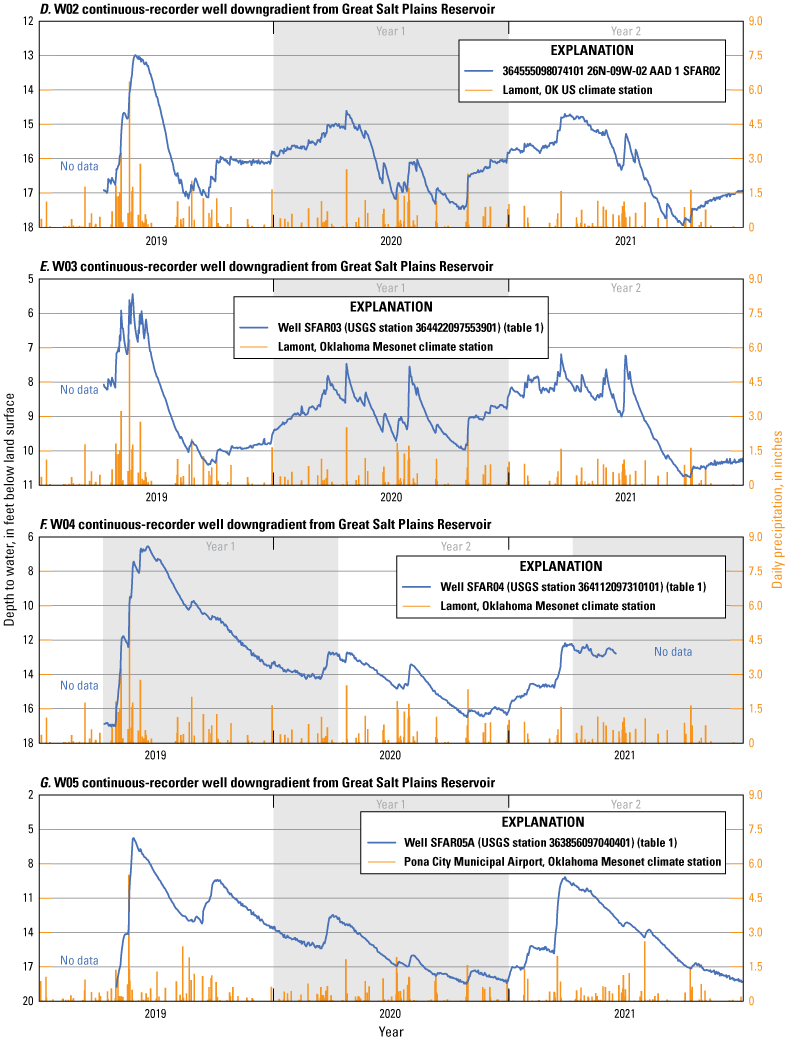 Construction of the Great Salt Plains Reservoir was authorized in 1936 for the purposes of flood control and wildlife conservation in the approximately 32,000-acre Salt Plains National Wildlife Refuge, which mostly surrounds the reservoir (USACE, 2023a; U.S. Fish and Wildlife Service, 2023). In 1941, the Great Salt Plains Reservoir was impounded on the Salt Fork Arkansas River about 70 river mi from the Kansas State line, along the eastern edge of a feature known locally, and referred to herein, as the “Great Salt plains” in northern Oklahoma (Horizon Systems Corporation, 2015). Because saline groundwater wells up to the surface from local “salt seeps,” the reservoir was not designed for use as a water supply. At a conservation-pool altitude of about 1,125 ft above the North American Vertical Datum of 1988 (NAVD 88), the reservoir is relatively shallow, with a maximum depth of about 16 ft (OWRB, 2023) and storage of about 26,000 acre-feet (acre-ft) (USACE, 2023b). The 310-ft-wide primary spillway is uncontrolled (ungated), so releases from the reservoir are continuous except during times of drought (USACE, 2023a). Unlike nearby drainage basins in Oklahoma (Ellis and others, 2020; Rogers and others, 2023), the drainage basins of the Salt Fork Arkansas and Chikaskia Rivers contain relatively few Natural Resources Conservation Service floodwater-retarding structures (fig. 2) or other large dams (associated with labeled reservoirs in fig. 2) that alter the surface-water hydrology.