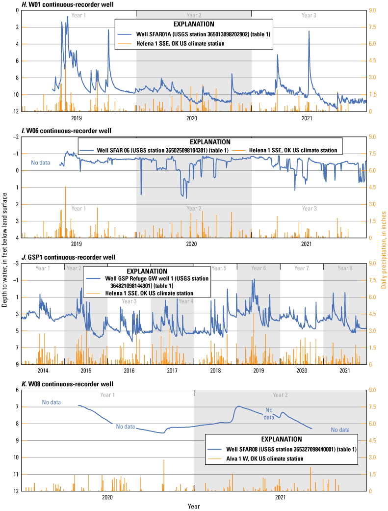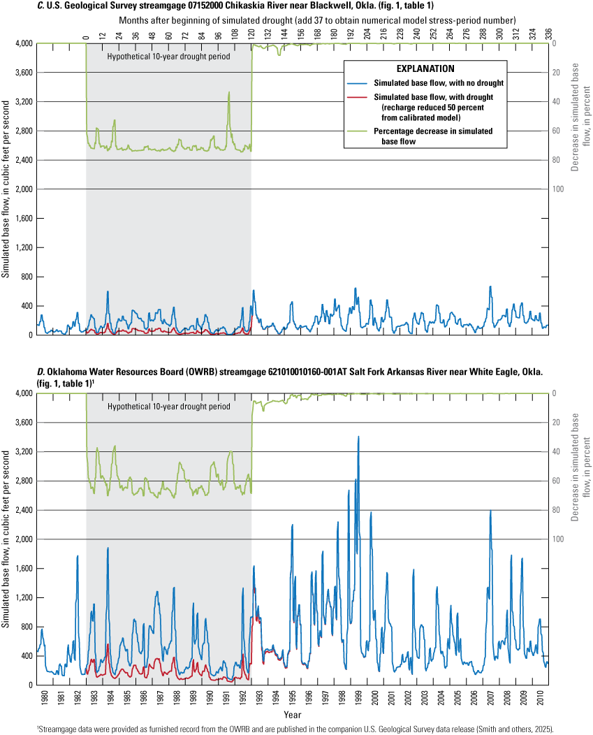 The Salt Fork Arkansas River and Chikaskia River alluvial aquifers are long, narrow, connected, unconfined aquifers that consist mostly of unconsolidated alluvial, terrace, and dune deposits in Alfalfa, Garfield, Grant, Kay, Noble, and Woods Counties in northern Oklahoma (fig. 1). In the eastern part of the study area, the Salt Fork Arkansas and Chikaskia Rivers are perennial except during extreme droughts, as documented by historical USGS streamgage records for each stream obtained from the USGS National Water Information System (NWIS) database (USGS, 2024; table 1). In the western part of the study area, the Salt Fork Arkansas River typically has no flow (defined herein as daily discharge less than 1 cubic foot per second) for several days per year. The Salt Fork Arkansas River generally flows west to east for about 175 miles (mi) (Horizon Systems Corporation, 2015) in Oklahoma. In the study area, the Chikaskia River generally flows north to south for about 50 mi (Horizon Systems Corporation, 2015), joining the Salt Fork Arkansas River east of Tonkawa, Okla.