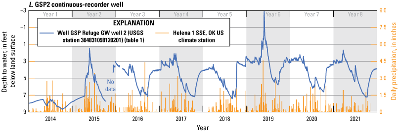 | Station name | Short name for station or other identifier | Station number or identifier (fig. 1) | Latitude (decimal degrees NAD 83) | Longitude (decimal degrees NAD 83) | County | Period of record (may contain gaps) (M/D/Y) | Land-surface altitude (feet above NAVD 88) |