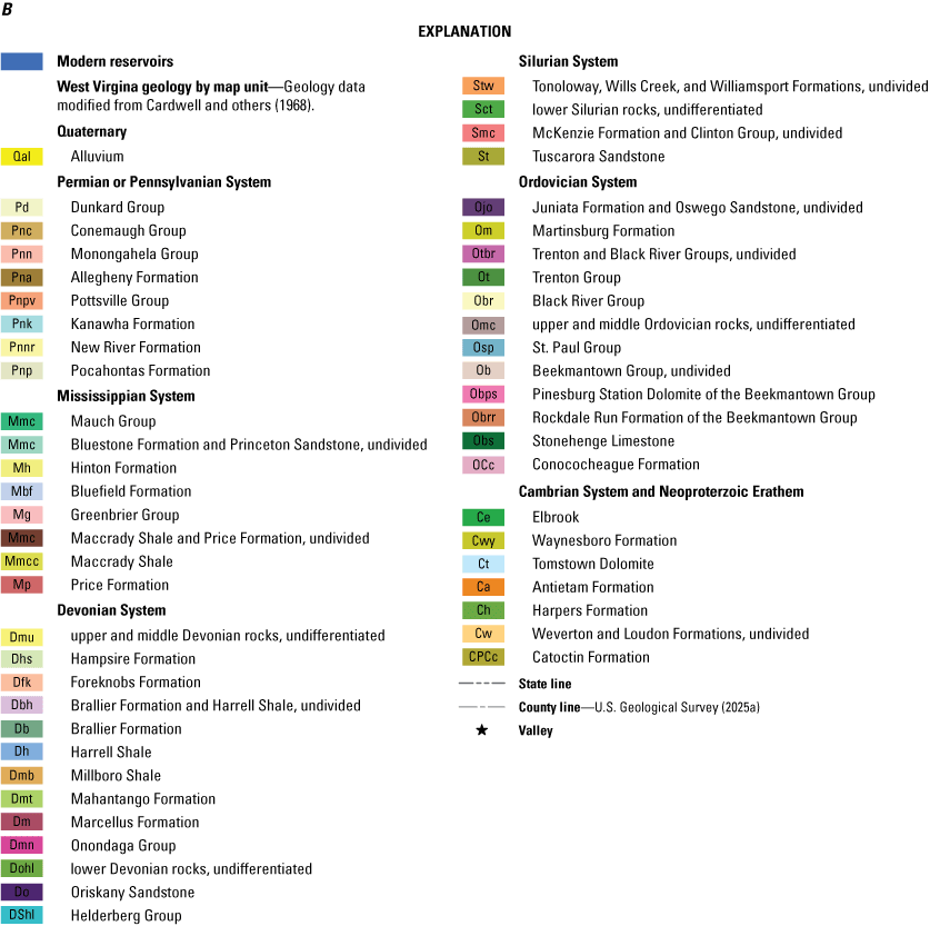 Geologic map showing the major formation or geologic groups in West Virginia. A, Geologic map. B, Geologic map explanation.