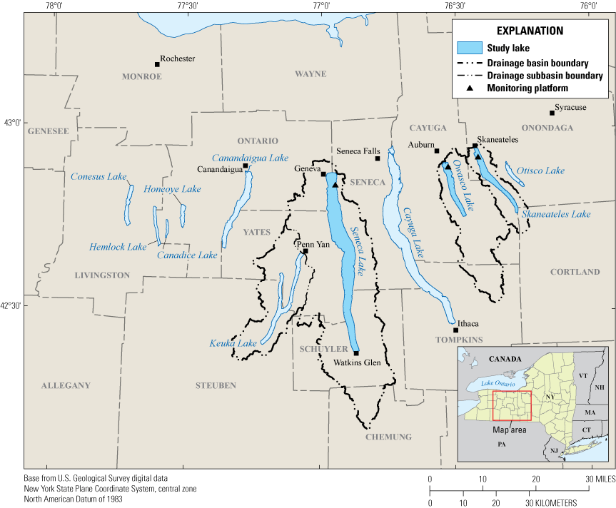 The Finger Lakes are important recreational, drinking water, and economic resources for New York State (NYSDEC, 2019; Halfman and others, 2023). The Finger Lakes region encompasses 11 narrow north-south-oriented glacial lakes in western New York, south of Lake Ontario (not shown; fig. 1). About 8 percent of New York is in the Finger Lakes watershed, which covers about 12,000 square kilometers (km2) and all or part of 12 counties (Callinan, 2001). In recent decades, cyanoHAB frequency has increased in the Finger Lakes (NYSDEC, 2020). In 2017, all 11 Finger Lakes experienced open water or shoreline cyanoHABs, even those historically characterized by low concentrations of nutrients and chlorophyll a (NYSDEC, 2018). Previous studies on the Finger Lakes and other lakes in New York State have documented the spatiotemporal heterogeneity of cyanoHABs and cyanotoxins within and among lakes (NYSDEC, 2019; Smith and others, 2019; Prestigiacomo and others, 2023; Gorney and others 2023). Seneca Lake (USGS site 425027076564401), Owasco Lake (USGS site 425327076313601), and Skaneateles Lake (USGS site 425606076251601; for additional information about all sites, refer to U.S. Geological Survey, 2016) were chosen for this pilot study in part because they represent a continuum of trophic states, from oligotrophic (low nutrient concentrations) to mesotrophic (moderate nutrient concentrations; Callinan, 2001; NYSDEC, 2019).