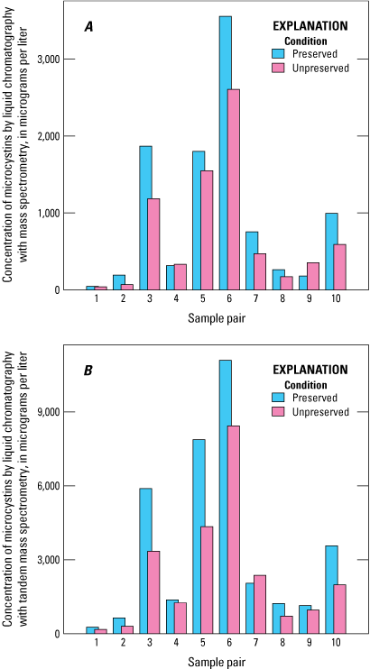 Bar graphs comparing microcystins concentration of 10 paired preserved and unpreserved samples determined using mass spectrometry methods: A, liquid chromatography with mass spectrometry (LC–MS); B, liquid chromatography with tandem mass spectrometry (LC–MS/MS). Data from Stouder and others (2024); National Water Information System (USGS, 2016).