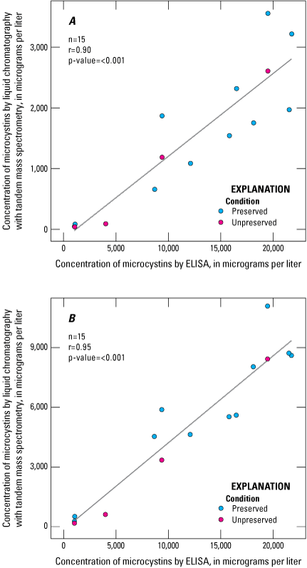 The mean microcystins concentration measured by ELISA was about eight times higher than the mean concentration measured by LC–MS and about two times as high as the mean concentration measured by LC–MS/MS (table 8). Although the strong linear correlations between these analysis methods were not substantially affected by preservation status (fig. 5), the differences in these ratios were smaller in preserved mass spectrometry samples and larger in unpreserved mass spectrometry samples because of higher microcystins concentrations observed in the preserved samples than in the unpreserved samples (fig. 4). These results are based on a small sample set (four unpreserved samples), so it is still uncertain whether the correlation of ELISA to mass spectrometry methods is affected by the preservation status of the samples analyzed by mass spectrometry (fig. 5).