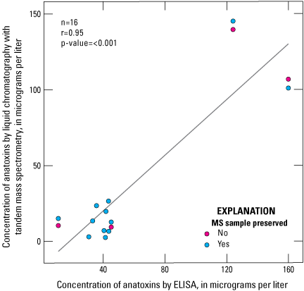 Anatoxin concentrations by ELISA had a strong linear correlation to anatoxin concentrations by LC–MS/MS analysis (r=0.90; fig. 6). Anatoxins concentrations measured by ELISA are generally higher than those measured by LC–MS/MS, by an average of about 55 percent (table 12; fig. 6). Preservation status affected the absolute anatoxins concentration; in a comparison of eight paired preserved and unpreserved samples, overall, anatoxins concentrations measured by LC–MS/MS in the preserved samples were higher than in unpreserved samples by an average of about 31 percent (fig. 7). Although figure 6 shows there is a strong linear correlation between ELISA and LC–MS/MS results for anatoxins, these results are heavily influenced by two pairs of preserved and unpreserved samples. When those two pairs are not considered, the correlation between ELISA and LC–MS/MS anatoxin concentration is very weak (r=0.03). Furthermore, the sample set included just four unpreserved samples that were available for analysis, complicating efforts to determine whether the correlation is influenced by preservation status in the samples analyzed by mass spectrometry (fig. 6).