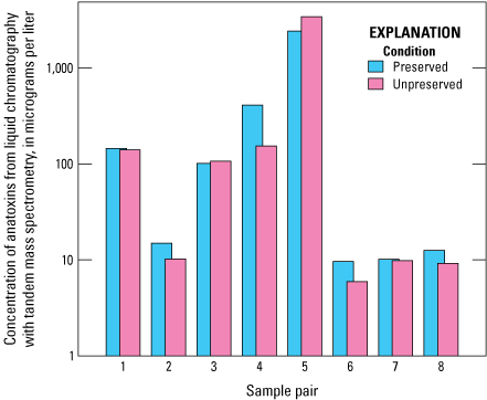 Bar graph comparing anatoxin concentrations of eight paired preserved and unpreserved samples as determined by using liquid chromatography with tandem mass spectrometry (LC–MS/MS). Data from Stouder and others (2024); National Water Information System (USGS, 2016).