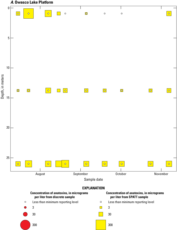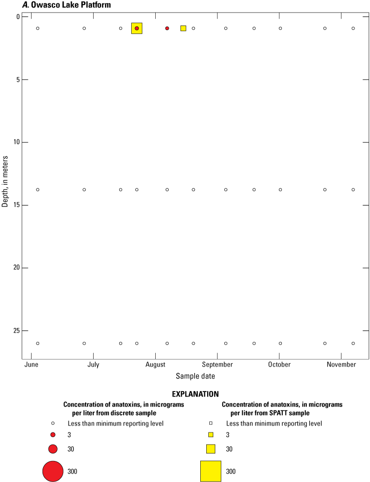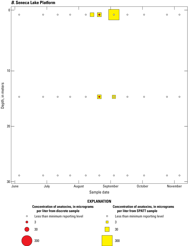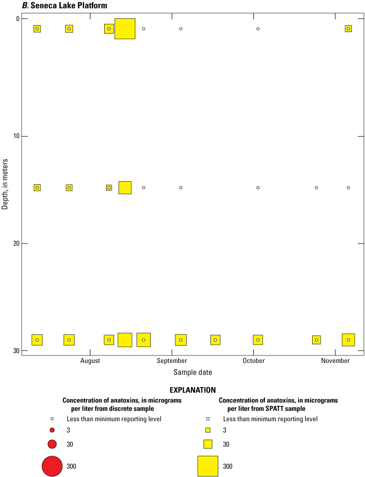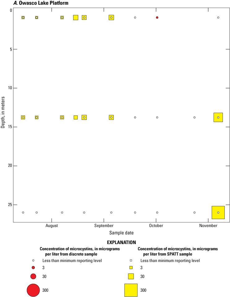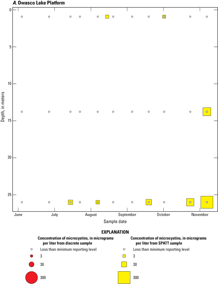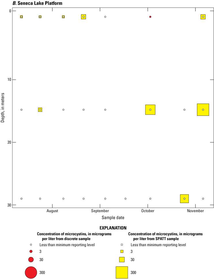 As part of the advanced monitoring pilot study, discrete water-quality samples were collected every 2 weeks. These samples were analyzed for biological and physicochemical variables, including immunoassay (ELISA) and chromatographic (that is, mass spectrometry; LC–MS and LC–MS/MS) quantification of total cyanotoxin concentrations in whole water. Discrete samples that coincided with SPATT recoveries were used to aid in interpretation of the SPATT results.