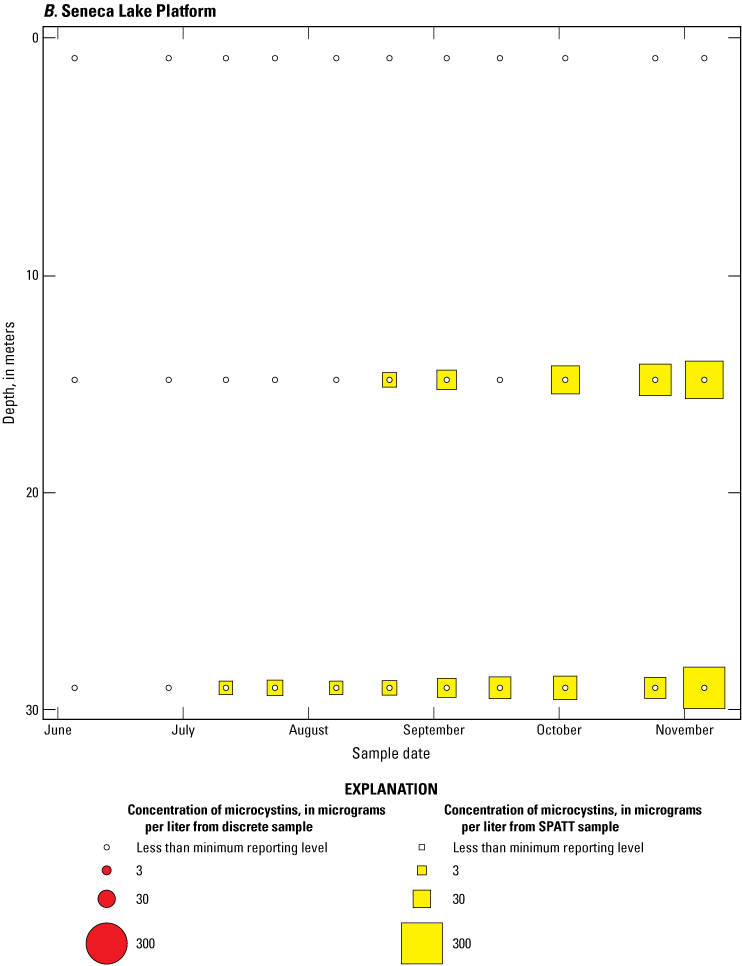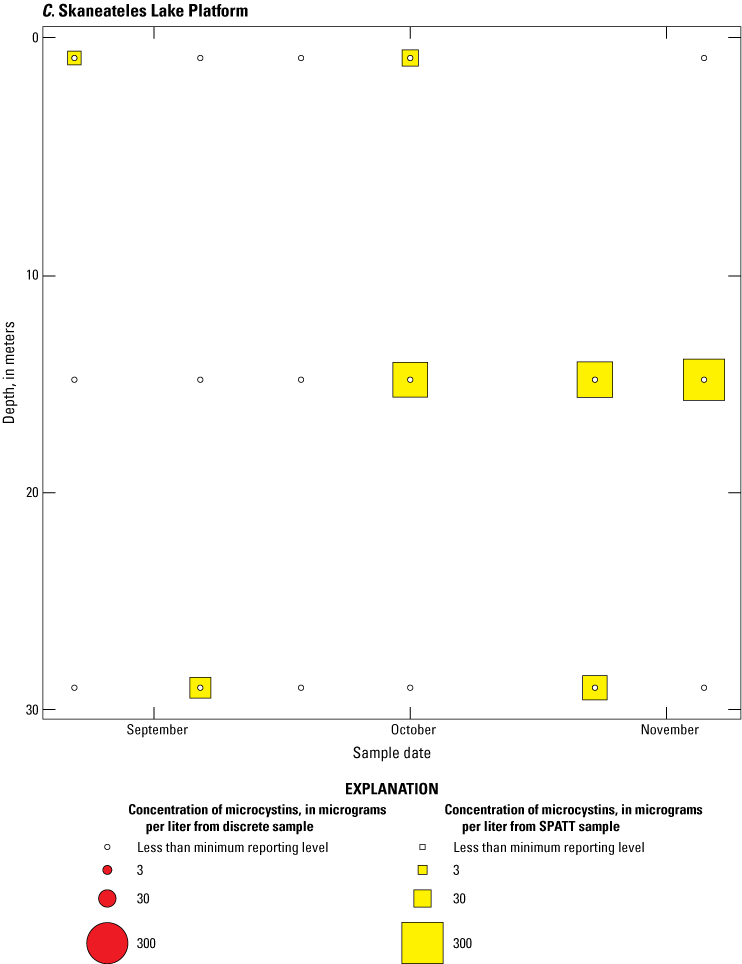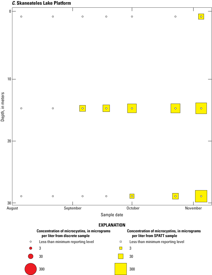 Bubble plots of temporal and depth variation in microcystin concentrations analyzed by enzyme-linked immunosorbent assay (ELISA) in discrete and solid phase adsorption toxin tracking (SPATT) samples for A, Owasco Lake; B, Seneca Lake; and C, Skaneateles Lake. Discrete microcystin concentration are given as instantaneous values; SPATT microcystin concentrations are given as daily mean values. Data from Stouder and others (2024); National Water Information System (USGS, 2016).