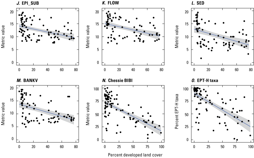 Plots showing linear model results with significant relationships between the percentage of 2016 developed land cover in a given site’s watershed and the following indicator metrics: A, total phosphorus, B, temperature, C, salinity, D, high-flow frequency, E, low-flow frequency, F, low-flow magnitude, G, Bank Stability (BANKS), H, Embeddedness (EMBED), I, Epifaunal Substrate/Available Cover (EPI_SUB), J, Channel Flow Status (FLOW), K, Sediment Deposition (SED), L, Bank Vegetation (BANKV), M, macroinvertebrate Chesapeake Basin-wide Index of Biotic Integrity (Chessie BIBI), and N, percentage Ephemeroptera, Plecoptera, and Trichoptera taxa (excluding the tolerant family Hydropsychidae) (EPT-H).