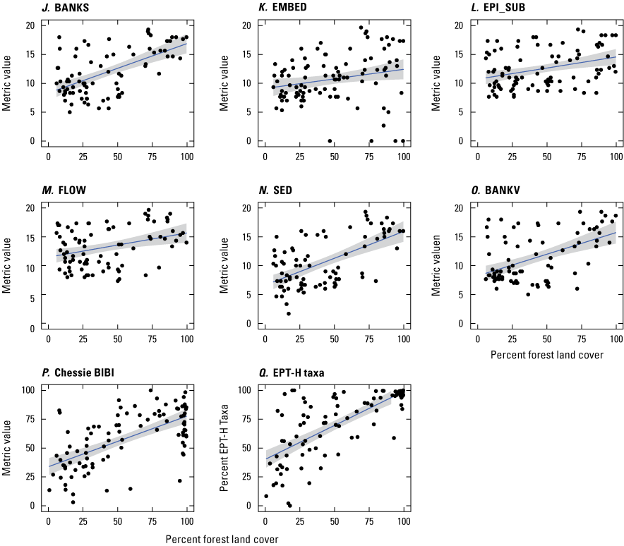 Plot showing linear model results with significant relationships between the percentage of 2016 forest land cover in a given site’s watershed and the following indicator metrics: A, total nitrogen, B, total phosphorus, C, suspended sediment, D, temperature, E, salinity, F, high-flow duration, G, high-flow frequency, H, high-flow magnitude, I, low-flow magnitude, J, Bank Stability (BANKS), K, Embeddedness (EMBED), L, Epifaunal Substrate/Available Cover (EPI_SUB), M, Channel Flow Status (FLOW), N, Sediment Deposition (SED), O, Bank Vegetation (BANKV), P, macroinvertebrate Chesapeake Basin-wide Index of Biotic Integrity (Chessie BIBI), and Q, percentage of Ephemeroptera, Plecoptera, and Trichoptera taxa.