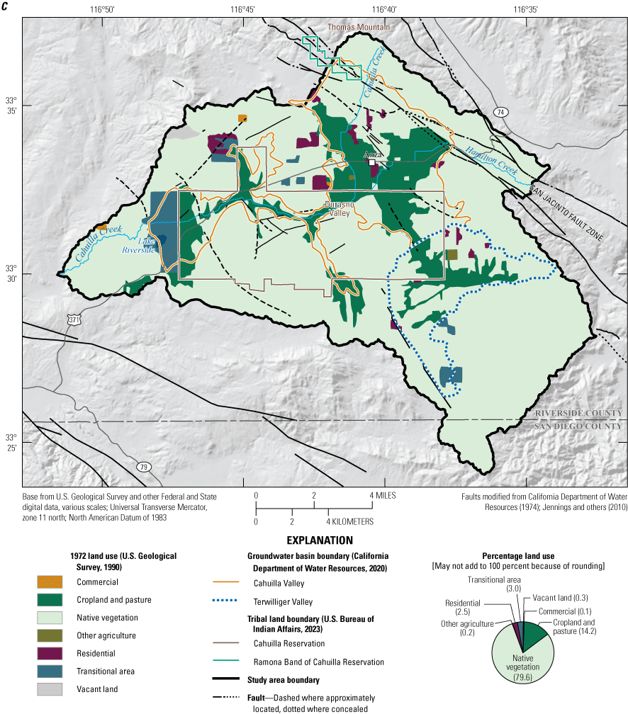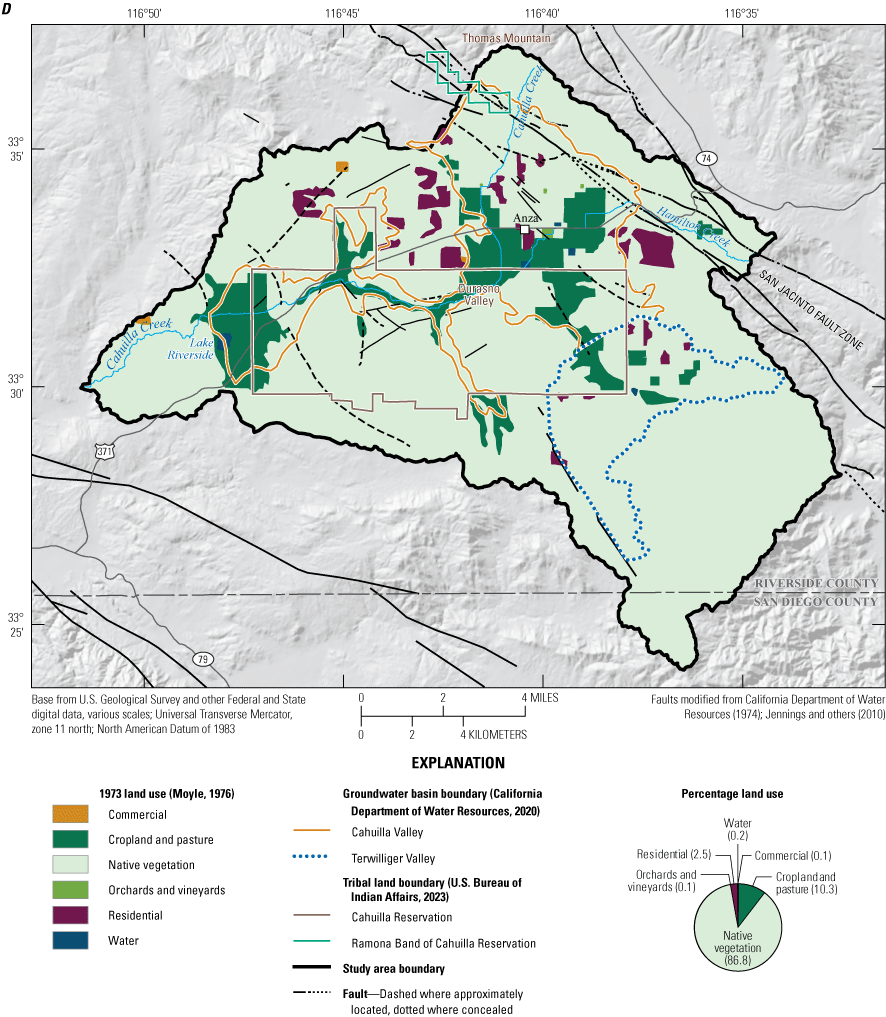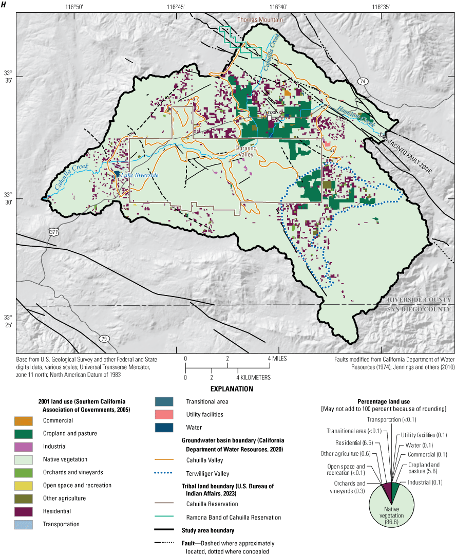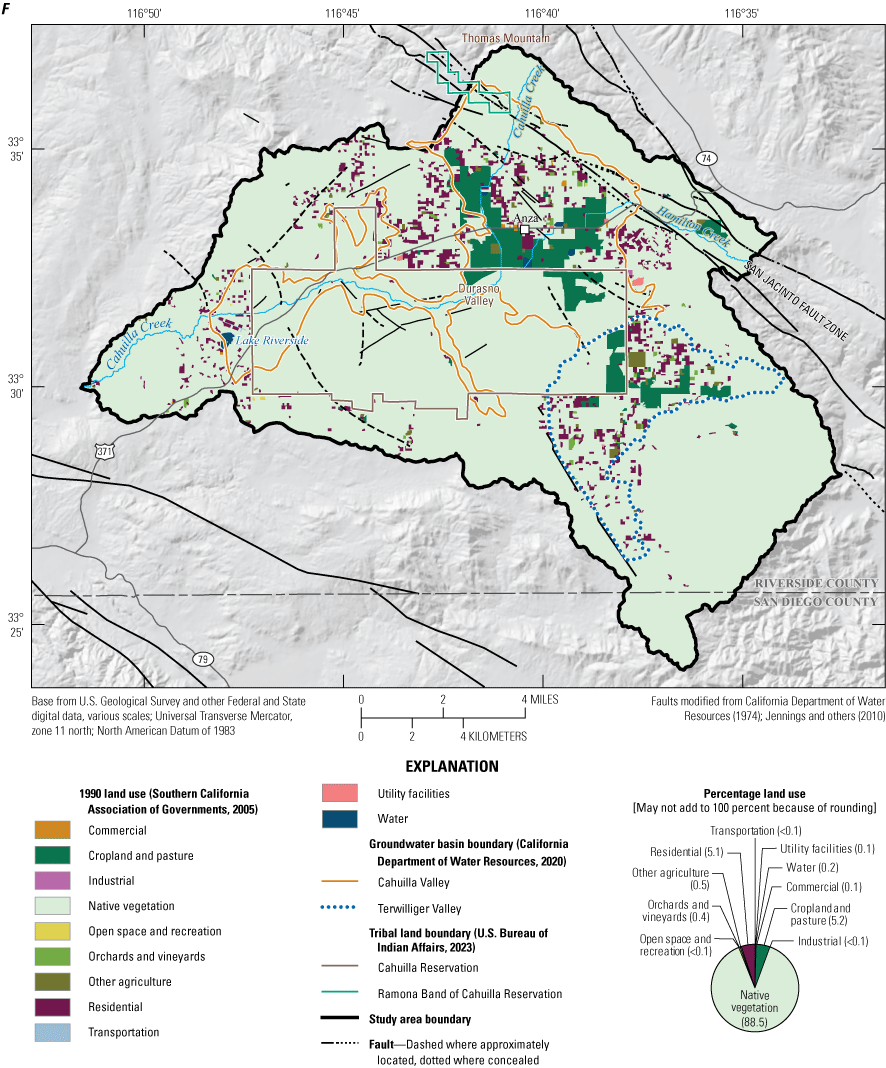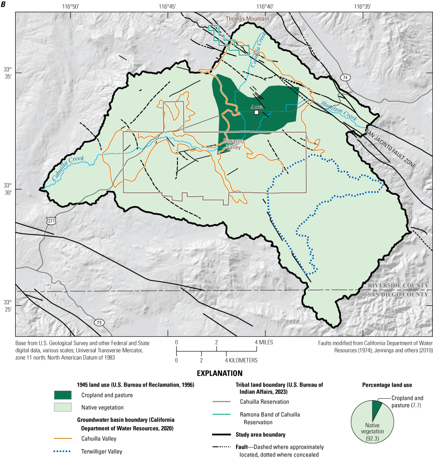 The study area is about 130 square miles (mi2) and is about 20 miles (mi) southwest of Palm Springs (fig. 1). By the end of the 19th century, a small group of the Cahuilla Band had settled in the lowlands of the basin. Today, the Cahuilla Reservation covers about 18,900 acres of the total 82,560 acres of the study area. The Ramona Band of Cahuilla covers about 1,350 acres, of which 755 acres are within the study area.