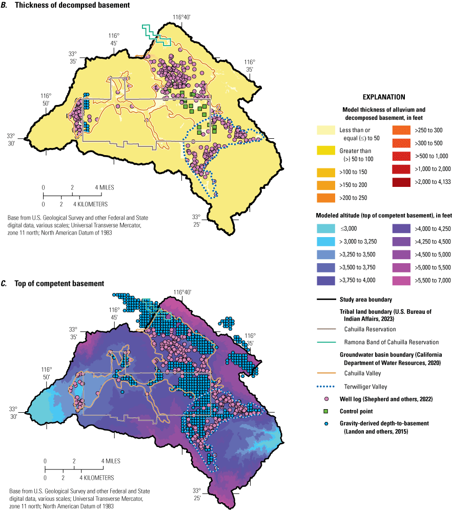 The thickness and extent of the alluvium is important to determine because these materials contain most of the groundwater in storage in the basins. Well logs compiled by Moyle (1976) showed that the thickness of the alluvium generally ranges from a few ft to about 550 ft; however, there are many places where well logs do not exist or are not available. To investigate the areal and vertical extent of the alluvium, Moyle (1976) completed a relative-gravity survey and determined that, in most places, the alluvium generally is thin and that the rocks of the basement complex are near, or very near, the surface, with the exception of four areas; these areas were confirmed by the isostatic residual gravity field and subsequent model results reported by Landon and others (2015; fig. 5). Both previous gravity studies indicated that the alluvium has an apparent thickness between 200 and more than 1,000 ft along the northeastern boundary of the Cahuilla Valley groundwater basin along the San Jacinto fault zone, and southwest of the Ramona Band of the Cahuilla Reservation. Two other areas where the alluvium is greater than 500 ft thick are the northeastern part of the Cahuilla Reservation in the Cahuilla Valley groundwater basin and the southeastern part of the Cahuilla Reservation in the Terwilliger Valley groundwater basin.