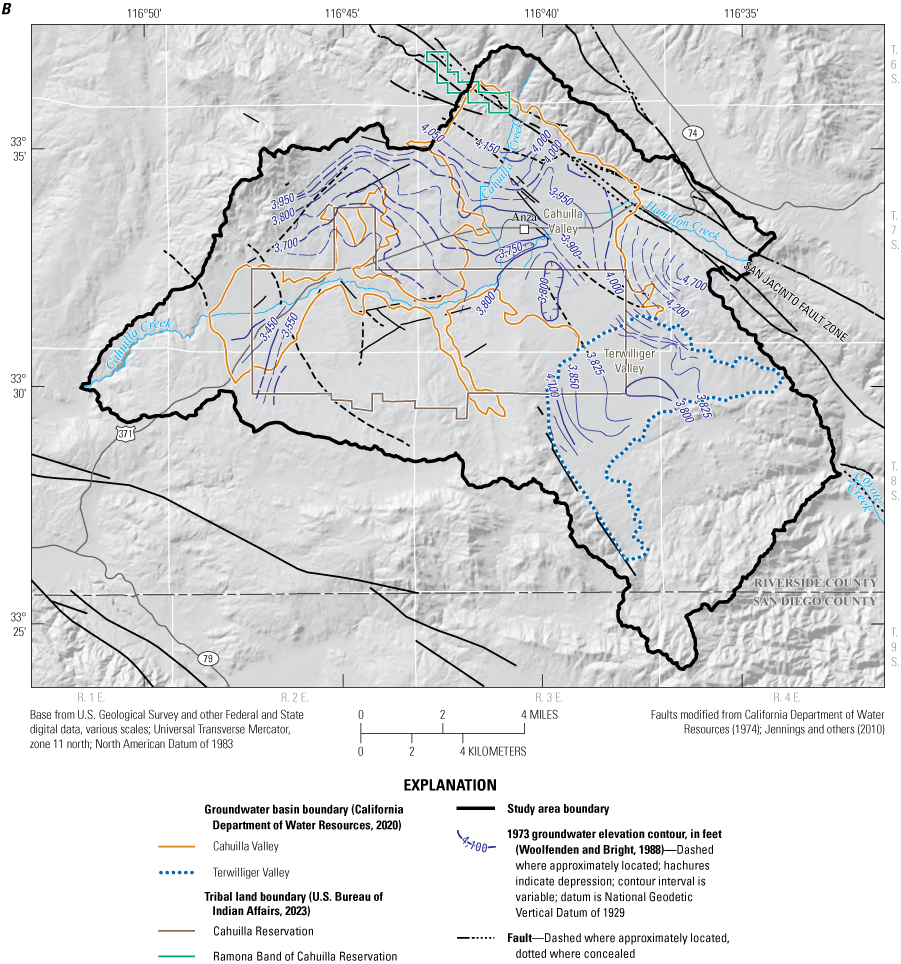 Groundwater is the sole source of water supply for a rural community and two Native American Tribes in the Anza Valley, California. The relation between the groundwater-bearing units of the surrounding Cahuilla Valley and Terwilliger Valley groundwater basins, and the amount of natural recharge to them, are not well understood. During the 20th century, the reliance on groundwater for agricultural, domestic, and municipal uses has often exceeded recharge, and there is the potential for changes in groundwater availability related to climate change. The Anza Valley is within the Cahuilla Valley groundwater basin, and rights to pump groundwater within it is adjudicated in U.S.A. v. Fallbrook Public Utility District, and others (Civil No. 51-CV-1247-GPC-RBB; U.S. District Court Southern District of California, 2021). To support the adjudication and management of water resources in the area, the Ramona Band of Cahuilla and the U.S. Geological Survey (USGS) initiated a cooperative study of the hydrogeologic system encompassing the Cahuilla Valley and Terwilliger Valley groundwater basins and parts of the San Felipe Creek and Santa Margarita River hydrologic subbasins (figs. 1, 2). The study area encompasses the rural community in and around the town of Anza and west of Lake Riverside, the southeastern part of the Ramona Band of Cahuilla Reservation, and the Cahuilla Reservation. Residents occupy widely dispersed dwellings throughout the study area, and the population in 2020 was estimated to be about 6,480 (Esri Data Development, 2023).