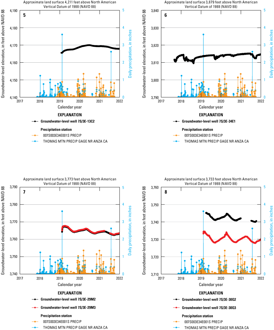 Wells and precipitation sites in the U.S. Geological Survey monitoring network near Anza, California (U.S. Geological Survey, 2021).[State well numbers based on "Well-Numbering System" section at beginning of this report. Abbreviations: NAVD 88, North American Vertical Datum of 1988; NWIS, National Water Information System (U.S. Geological Survey, 2023); USGS, U.S. Geological Survey; —, no data]