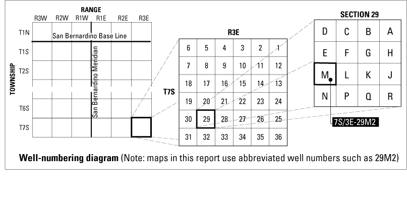 Wells are identified and numbered according to their location in the rectangular system for the subdivision of public lands. Identification consists of the township number, north or south; the range number, east or west; and the section number. Each section is divided into sixteen 40-acre tracts lettered consecutively (except I and O), beginning with “A” in the northeast corner of the section and progressing in a sinusoidal manner to “R” in the southeast corner. Within the 40-acre tract, wells are sequentially numbered in the order they are inventoried. The final letter refers to the base line and meridian. In California, there are three base lines and meridians: Humboldt (H), Mount Diablo (M), and San Bernardino (S). All wells in the study area are referenced to the San Bernardino baseline and meridian (S). Well numbers consist of 15 characters and follow the format 007S003E29M002S. In this report, well numbers are abbreviated and written 7S/3E-29M2. Wells that are not included in the U.S. Geological Survey (USGS) National Water Information System database are identified using the naming convention used in the original referenced report or non-USGS database.
