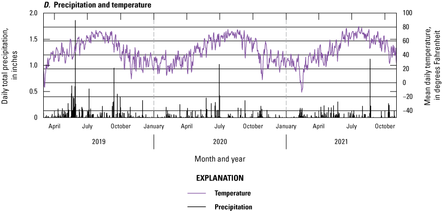 Analysis of daily precipitation and temperature data indicated that conditions in the study area during the 2019 agricultural year were wetter and colder than period of record normal, and drier and near normal temperatures for the 2020 and 2021 agricultural years. Not all sediment load records between 2019 and 2021 are complete because of rejected observations (outliers), instrument failures or fouling, and instrument removal for calibrations.