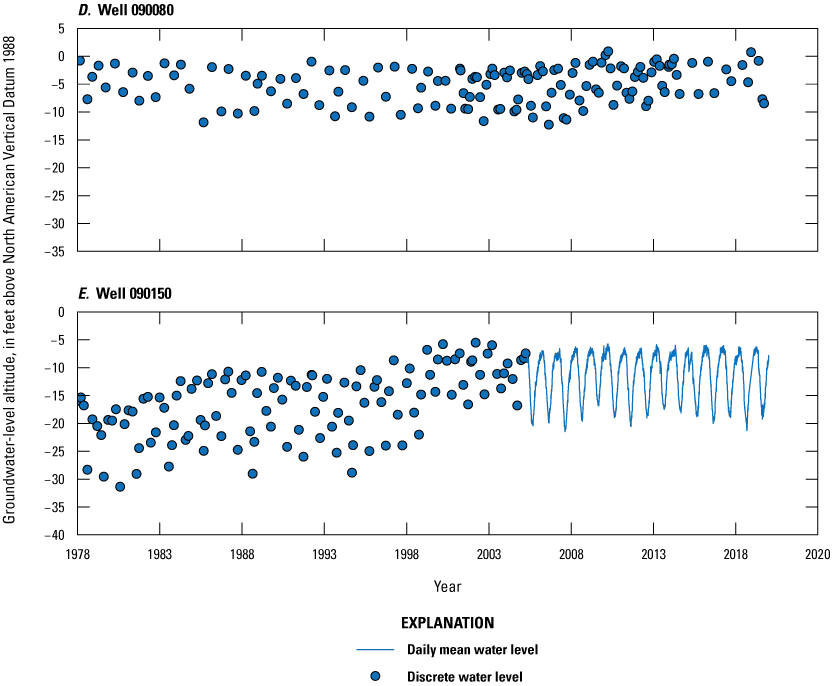 Hydrographs of five wells in the confined Cohansey aquifer are shown in figure 3. Wells 090048, 090049, 090080, and 090150 had similar water levels and had fluctuations with similar ranges during 2014–19 as during the historical period. In well 090060, which is the well closest to the cone of depression at less than 1 mile, water levels fluctuated within a narrower range from 2014 to 2019 than the historical period, with fewer water-level altitudes less than −20 ft and an overall higher mean water level.