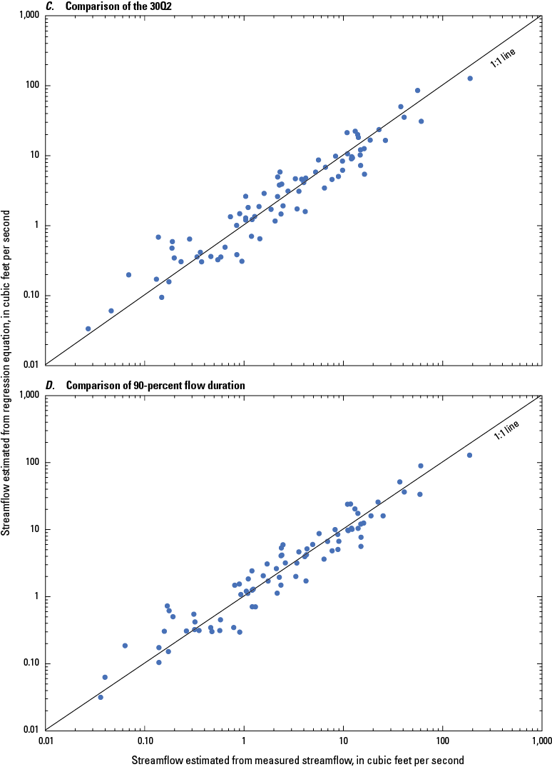 A separate set of regression equations were developed that only estimate annual flow durations between the 50- and 99-percentiles for the Plymouth-Carver-Kingston-Duxbury aquifer system in southeastern Massachusetts and Cape Cod (fig. 1; hereafter referred to as the “southeastern” equations). Additionally, similar streamflow statistics, for which equations were not developed, are also provided for the southeastern area. The streamflow statistics, basin characteristics (aquifer, elevation, physical, land-use, soil, surficial geology, and climate), regression analyses, and other information for the southeastern equations are provided in a separate USGS data release (Carlson, 2025; Sturtevant and others, 2025).