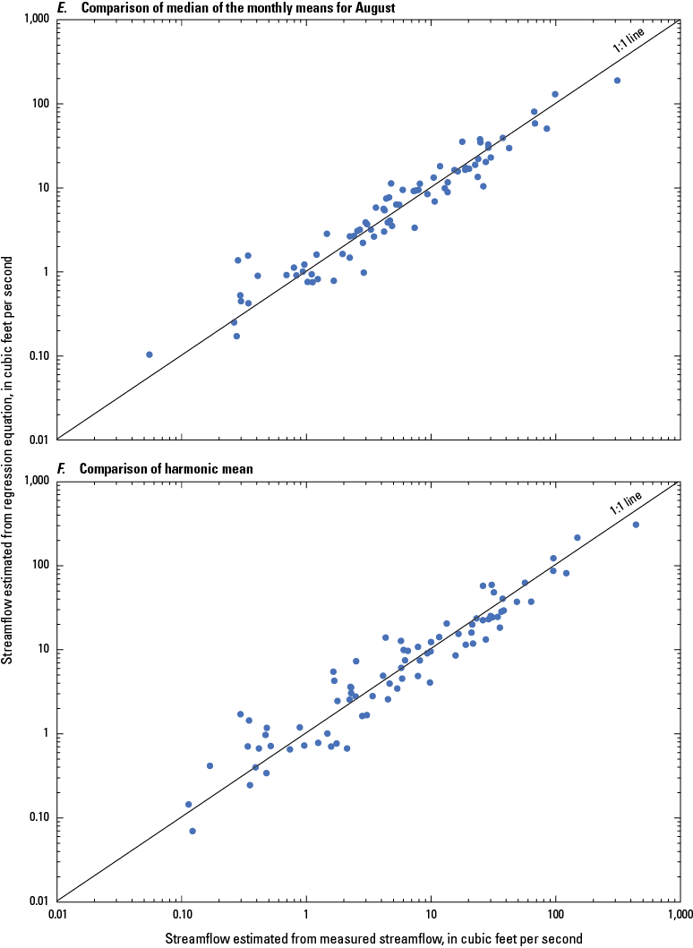 The streamflow statistics harmonic mean, monthly flow duration, median of the monthly means, and the median of the annual 7-day low flow were computed by using R packages (Bent and others, 2025). Harmonic mean was computed with the R DVstats package (U.S. Geological Survey, 2024b) according to the EPA DFLOW user’s manual (Rossman, 1990). The median of the annual 7-day low-flows was computed from the annual 7-day low-flow, which was determined by using the USGS Hydrologic Toolbox software (Barlow and others, 2022).